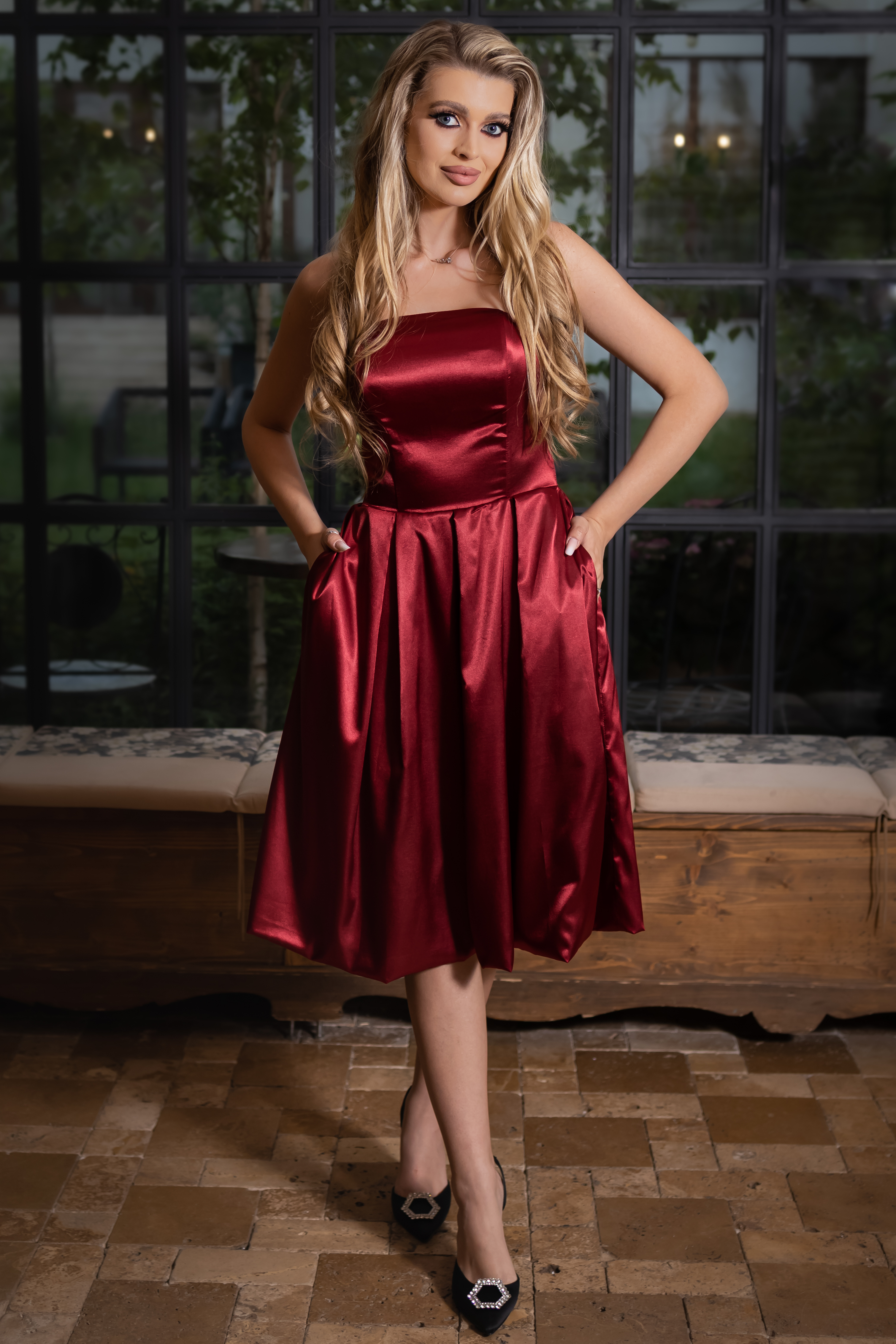 Rochie, eleganta din satin cu corsetCuloare: visiniuCroi: corset si croi in closFara maneciTextura: satinInchidere cu fermoar la spatePrezinta dublura din satin pe interiorCompozitie: 100% poliester Modelul are 1,70 m inaltime si poarta masura S. INFO: Echipa noastra face toate eforturile in a prezenta cat mai bine culorile produselor prezentate pe site insa culorile pot diferi de situatia reala si pot varia in functie de setarile monitorului/dispozitivului dvs! Instructiuni folosire: