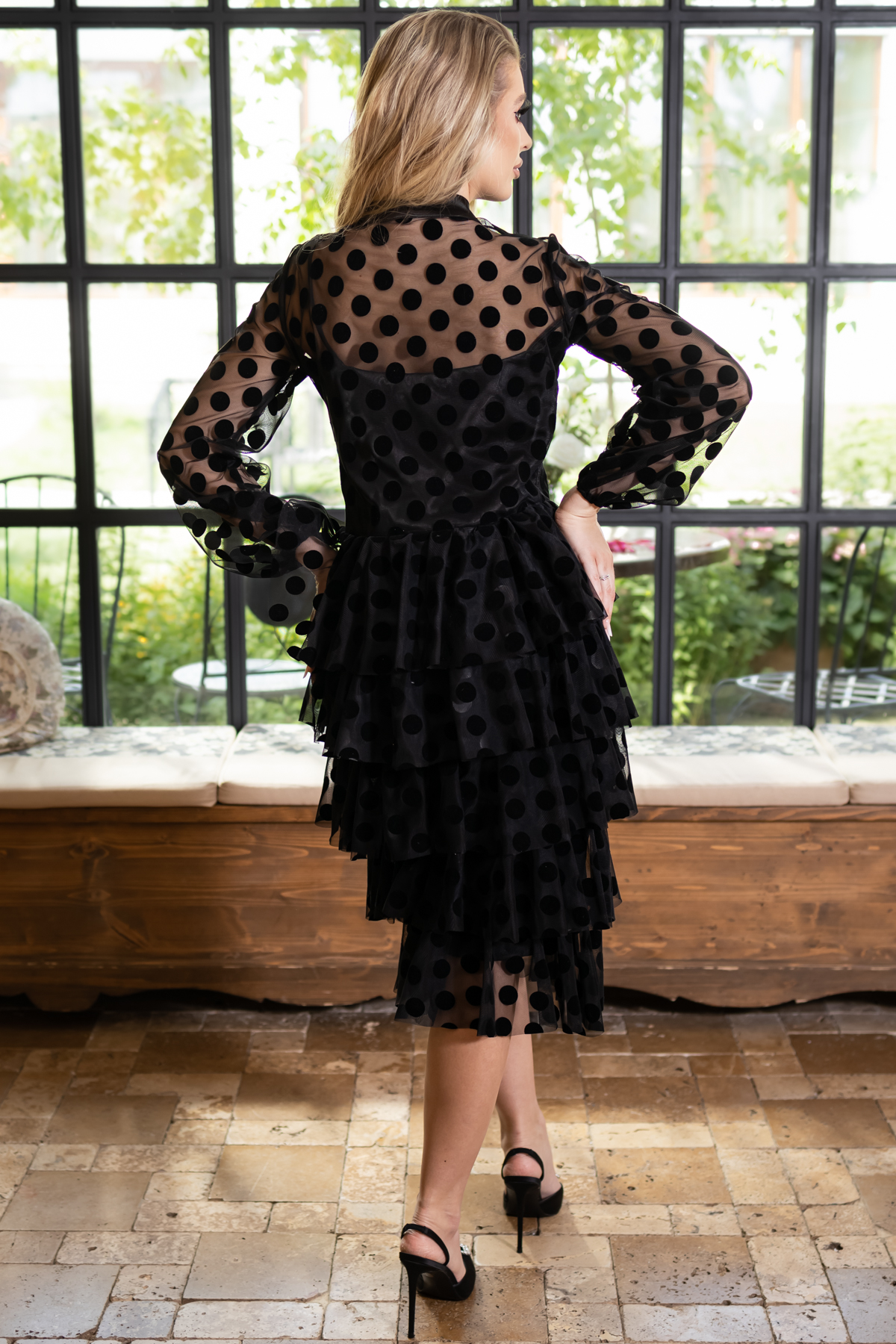 Rochie, eleganta din satin si tulle, cu volanaseCuloare: negru cu bulineCroi: pe corp, croi in clos cu volanasecu breteleDecolteu in VTextura: satin si tulleInchidere cu nasturiPrezinta dublura din satin pe interiorCompozitie: 100% poliester Modelul are 1,70 m inaltime si poarta masura S. INFO: Echipa noastra face toate eforturile in a prezenta cat mai bine culorile produselor prezentate pe site insa culorile pot diferi de situatia reala si pot varia in functie de setarile monitorului