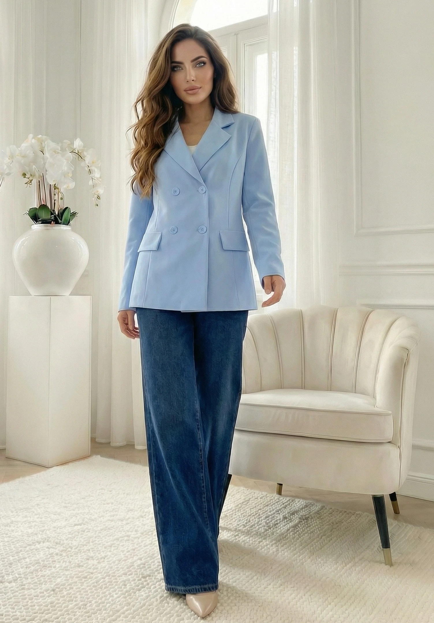 Sacou albastru deschis cu croiala cambrata si nasturi, o piesa vestimentara esentiala pentru o garderoba feminina si rafinata, remarcandu-se prin nuanta sa delicata. Designul acestuia este conceput sa urmareasca linia corpului, oferind o structura bine de