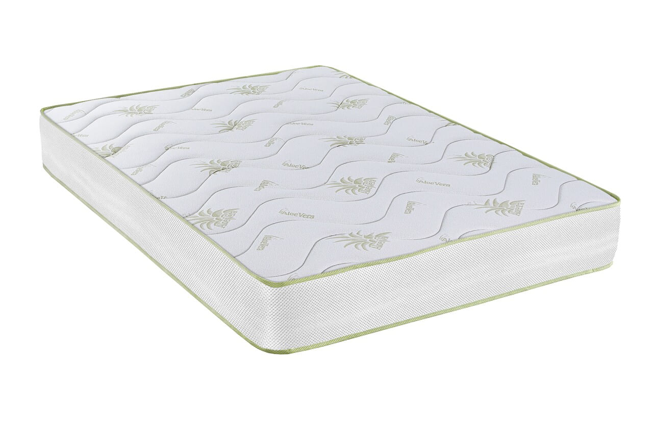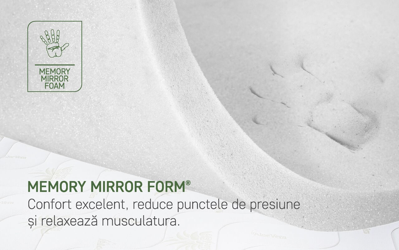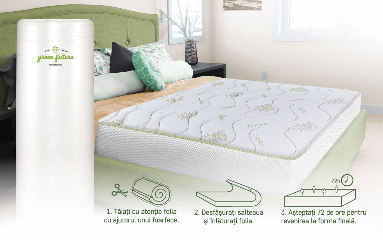 Dezvoltata de Green Future impreuna cu specialisti ortopezi, salteaua Aloe Vera Memory imbina calitatile ortopedice ale spumei elastice Green Form HD® cu proprietatile anti-inflamatoare binecunoscute ale extractului de Aloe Vera si ale fibrelor de bambus./nMateriale de calitate superioara/nSalteaua este conceputa cu materiale de cea mai buna calitate. Baza saltelei din spuma elastica Green Form HD® cu celulatie deschisa asigura o sustinere anatomica a corpului si o pozitie corecta a coloanei, fara dureri de spate in timpul somnului./nHusa saltelei este formata dintr-o tesatura moale si delicata cu ulei esential de Aloe Vera si vatelina cu fibre de bambus. Este matlasata pe partea superioara cu 2 cm de spuma Green Therm Memory®. Acest strat de confort reactioneaza la caldura corpului si se muleaza pe acesta eliminand punctele de presiune in timpul somnului pentru a relaxa muschii, asigurand o circulatie a sangelui corespunzatoare./n/nDenumita si Planta minune, Aloe Vera este folosita cu succes in scopuri terapeutice din timpuri stravechi pentru proprietatile ei antioxidante. Proprietatile naturale ale bambusului sunt binecunoscute. Agentul natural “bamboo-kun” din continutul fibrei de bambus nu permite dezvoltatea microbilor si bacteriilor pe suprafata fibrei si neutralizeaza mirosurile neplacute in special de transpiratie. Agentul propriu “bamboo-kun” nu permite daunatorilor sa atace planta si de aceea aceasta nu necesita tratamente chimice cu pesticide pentru crestere. Bambusul folosit in produsele Green Future corespunde standardului Oeko-Tex 100 si este testat in laboratoare atestate din Germania./nDatorita structurii cu goluri multe ale fibrei, aceasta este foarte absorbanta (cu 40% mai mult decat bumbacul) si permite evaporarea foarte rapida a umiditatii oferind un confort termic excelent. Mentinerea unui mediu uscat asigura un somn sanatos fara acarieni si mucegaiuri, principalii factori in aparitia alergiilor si mirosurilor neplacute./nTehnologia avansata a spumei suport Green Form HD® impreuna cu cea a stratului de Green Therm Memory® asigura un somn fara propagarea miscarilor partenerului./n/nHusa permite o aerisire premanenta datorita tesaturii Free Air 3D® care ajuta la mentinerea unui mediu uscat si sanatos./nDual confort!/nSalteaua poate fi utilizata pe ambele parti avand fermitati diferite: o parte foarte ferma cu strat de confort din fibre naturale de bumbac si o parte cu fermitate medie cu strat de confort de 2 cm din spuma memory si vatelina cu fibre de bambus./nDe ce sa cumperi salteaua Green Future Aloe Vera Memory:/n/nSuport ortopedic/nConfort termic/nDurabilitate/nCalitate/nIndicata pentru toate pozitiile de dormit: pe spate, pe lateral si pe stomac/n/n/nStructura:/n• Spuma poliuretanica elastica cu celulatie deschisa Green Form HD®• Spuma poliuretanica Green Therm Memory® - 2 cm• Husa cu ulei esential de Aloe Vera• Vatelina cu fibre de bumbac si bambus/nMod de ambalare: Vidata. Roluita/nInaltime saltea: 18 cm (+/-1 cm)/nPentru produsele infasurate in rulou, recomandam deschiderea/derularea imediat dupa achizitionare./n