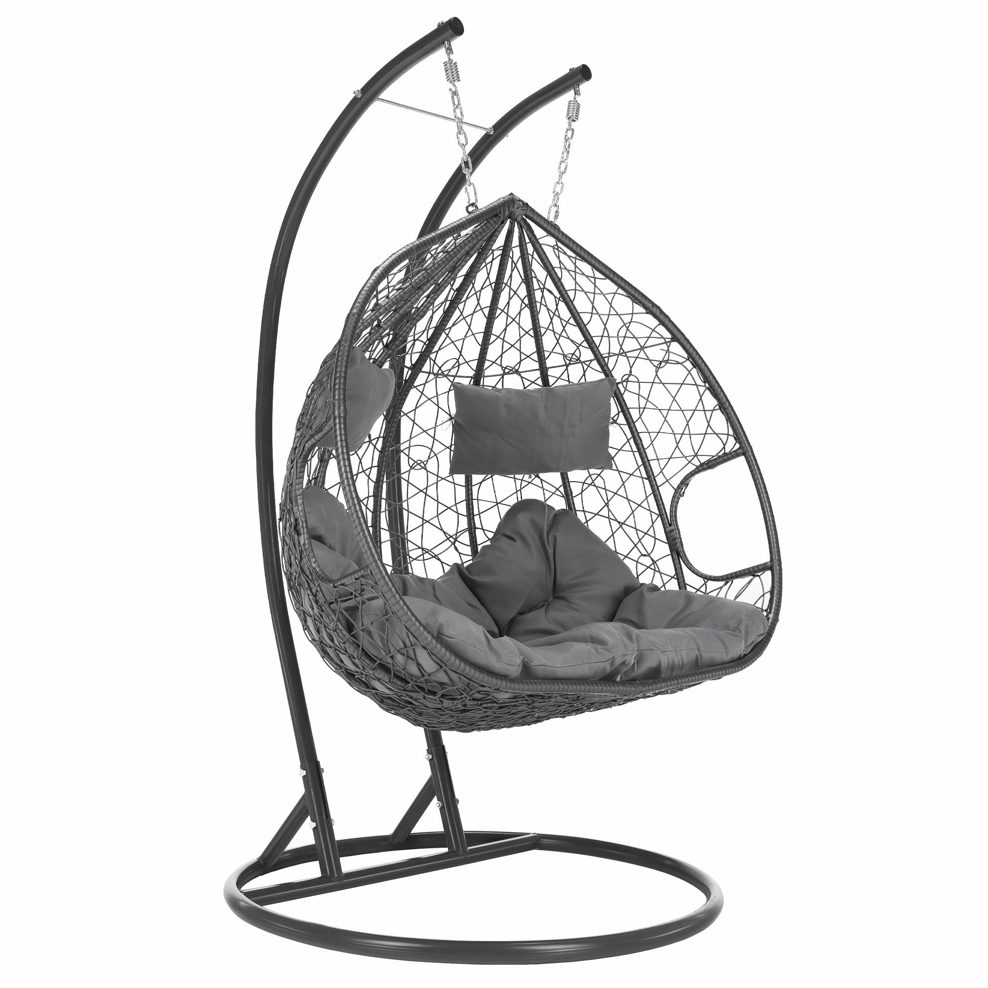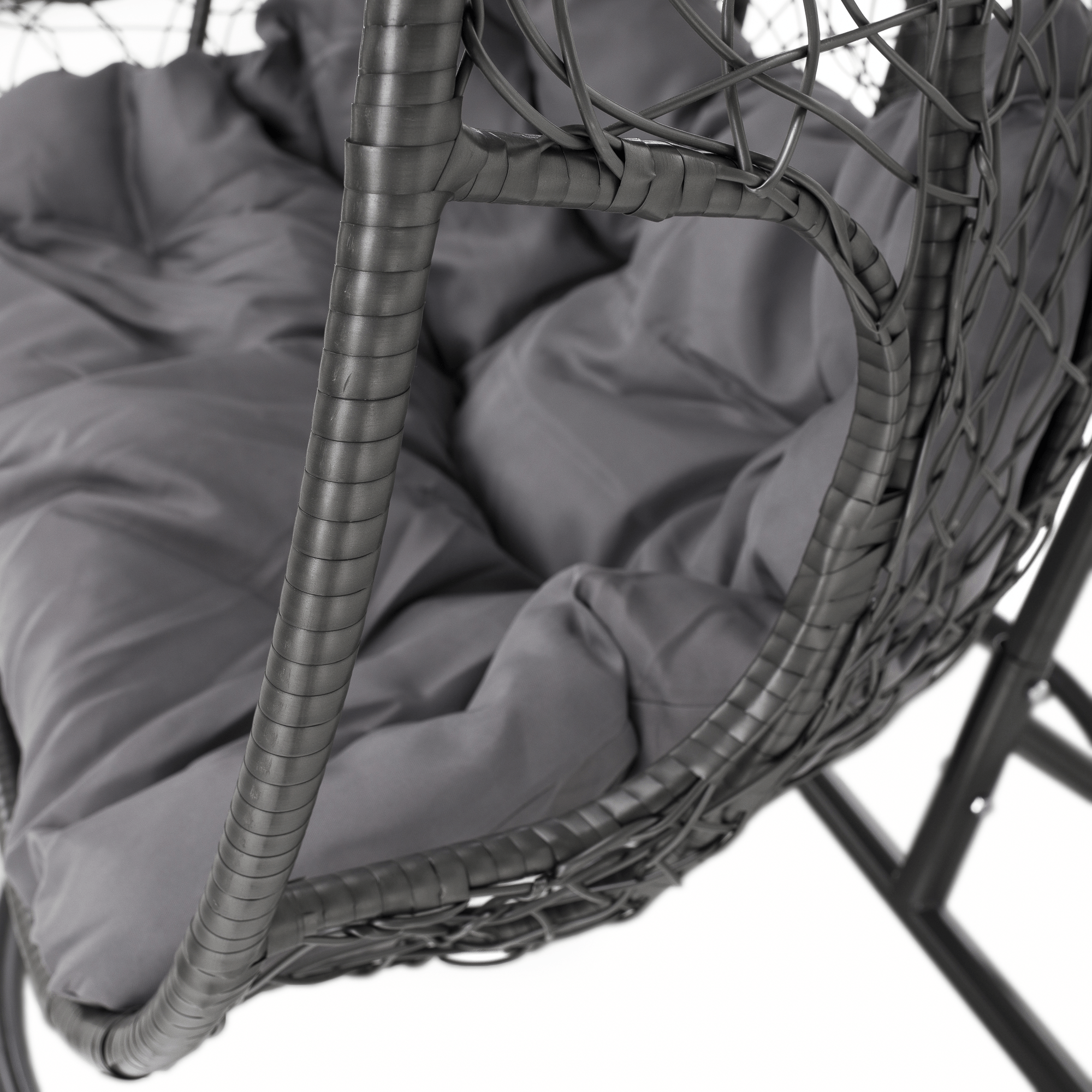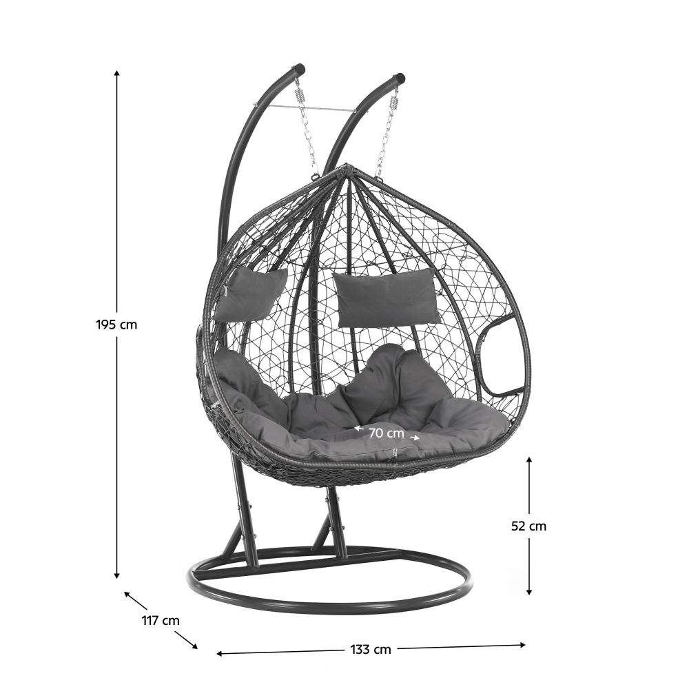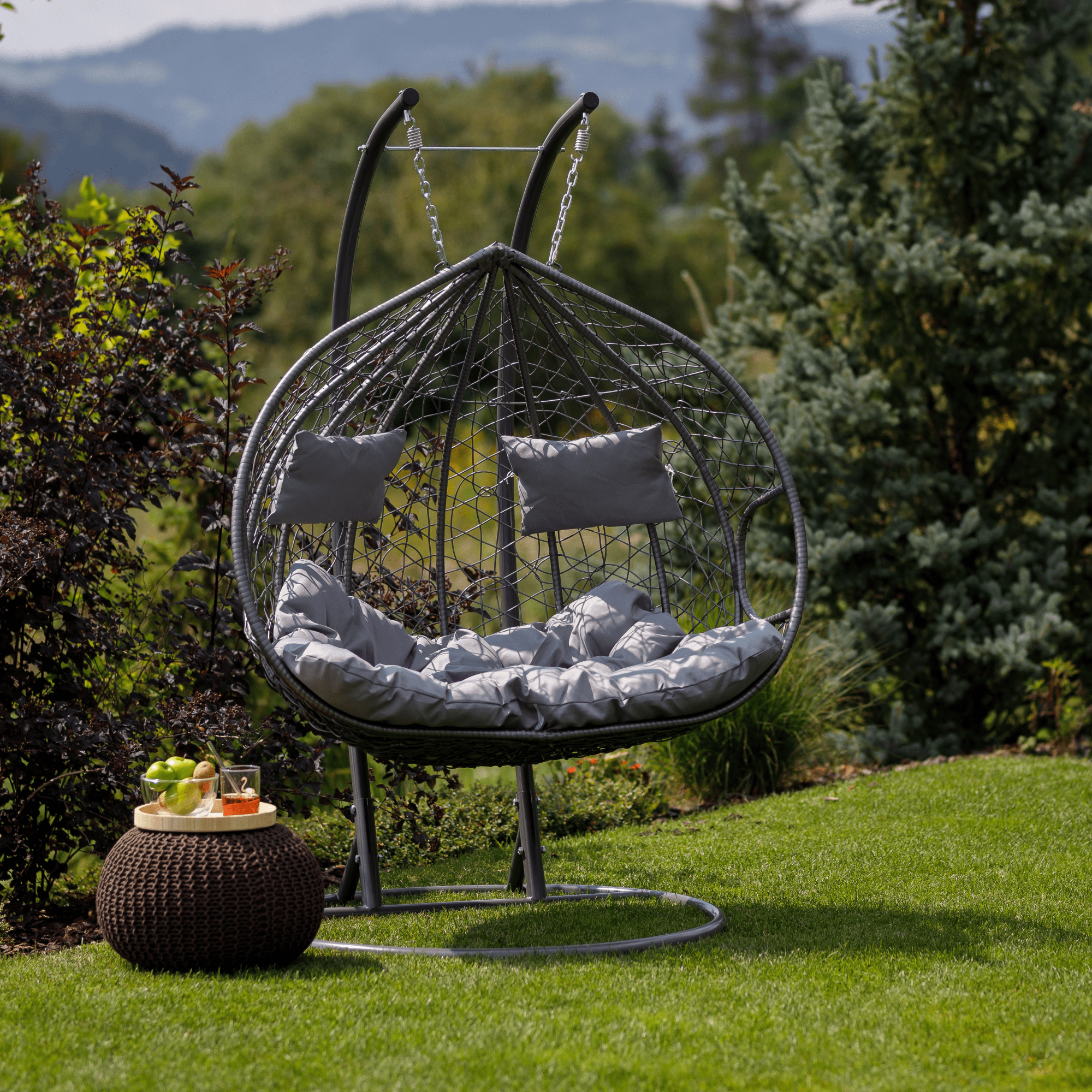 Material: metal/ratan sintetic/material textilCuloare: griDimensiuni scaun (lxAxh): 133x117x195 cmInaltime sezut: 52 cmAdancime sezut: 70 cmPortanta maxima: 200 kgCand sunteti in aer liber, va recomandam sa asigurati scaunul cu o husa sau cearsaf de protectiePotrivit pentru interior si exteriorCu pernaMosas elott el kell tavolitani a toltetet, es csak a huzatot szabad kimosniA huzat cipzarosLeveheto huzatMoshato 40 °C-onNe feheritseNe szaritsa szaritobanNe vasaljaNe tisztitsa vegyilegScaun dubluCadrul este inclus in pachetFeroneria pentru scaunul suspendat se afla direct in cadrul cercului