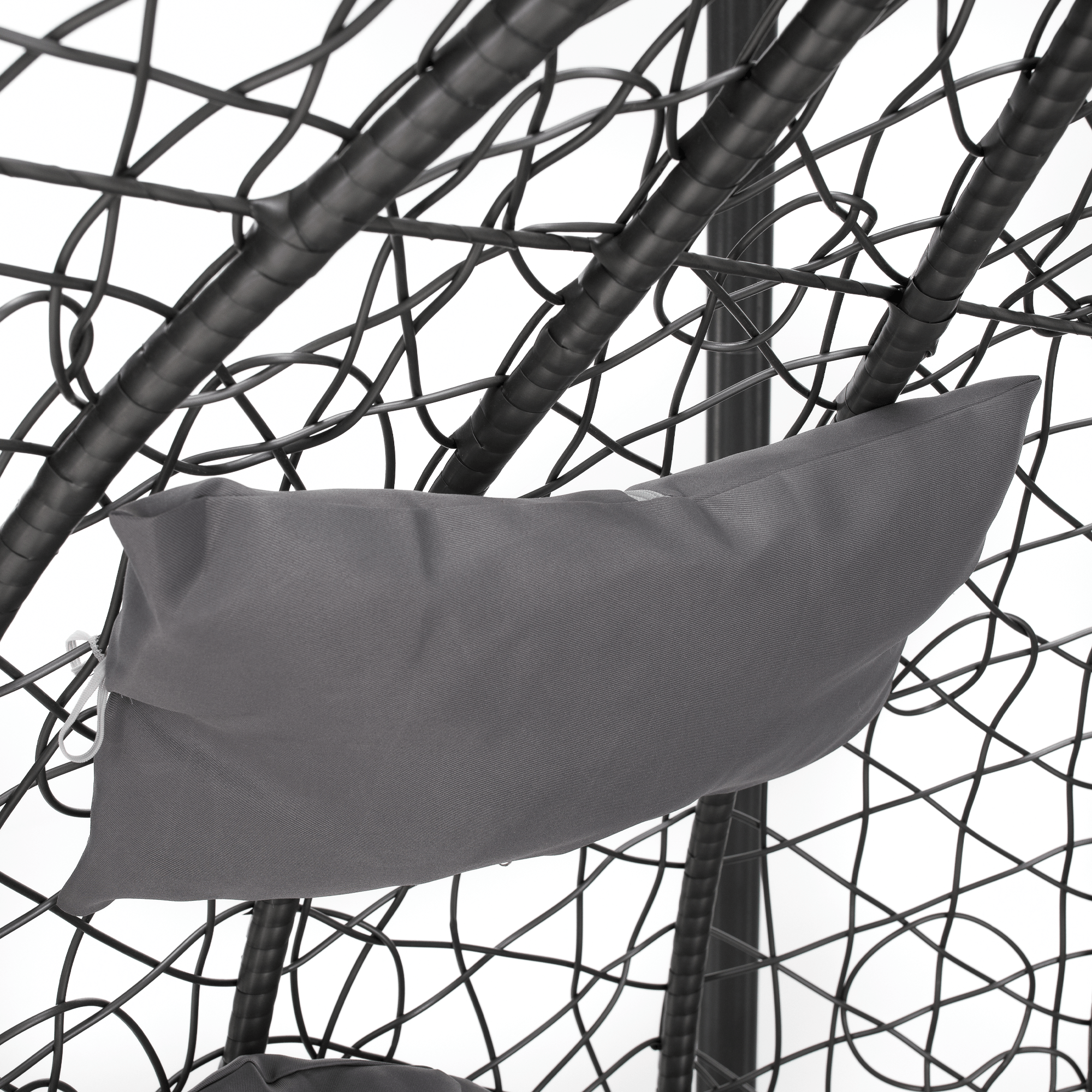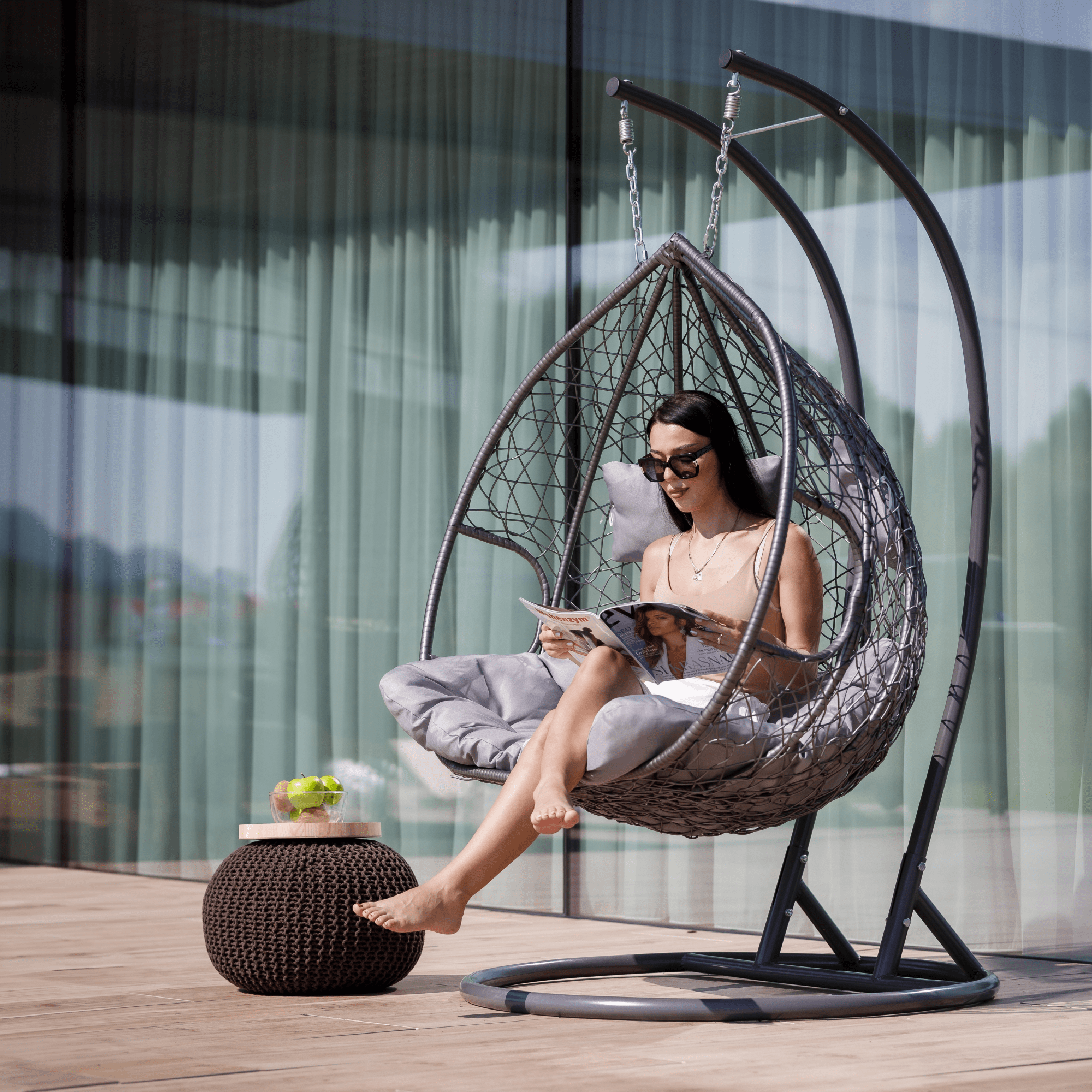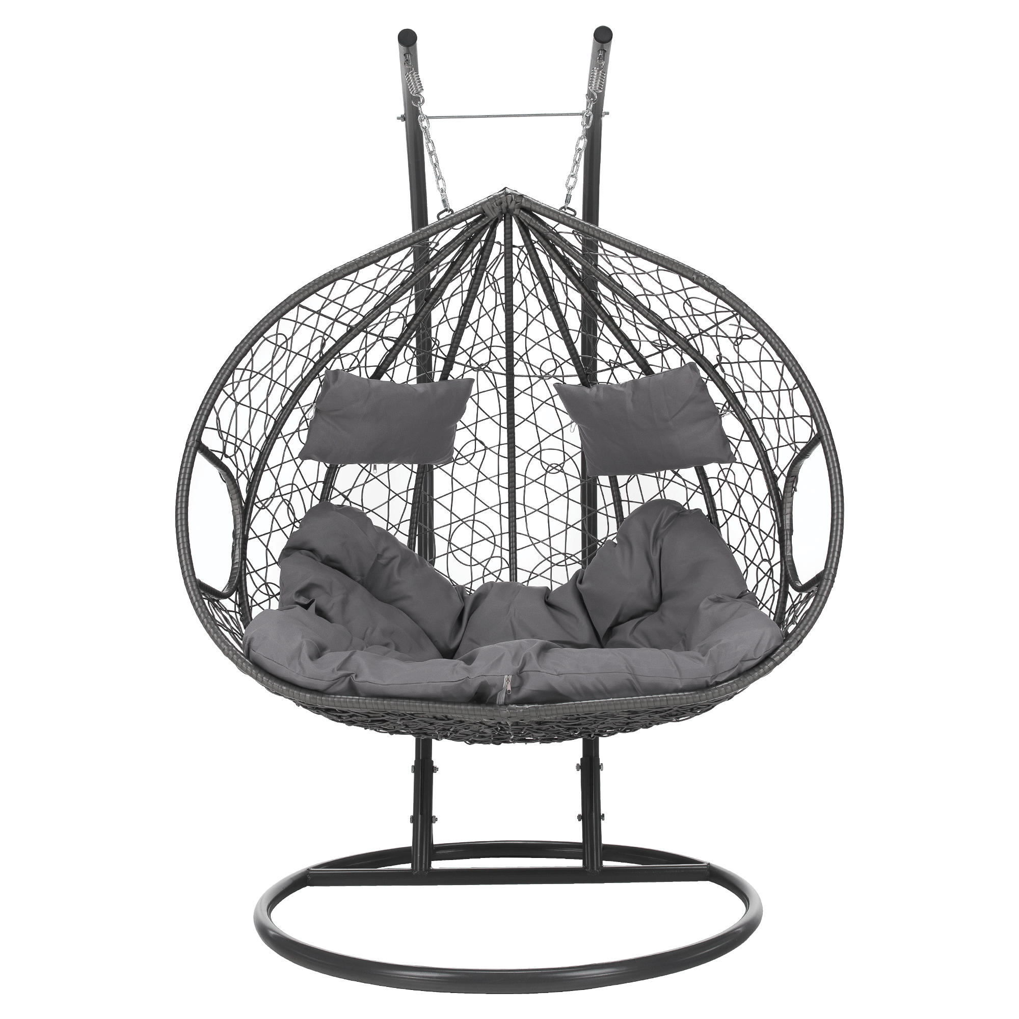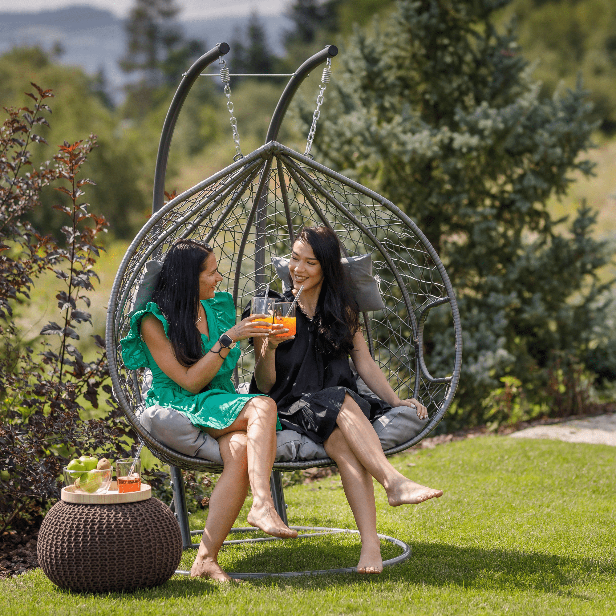 Material: metal/ratan sintetic/material textilCuloare: griDimensiuni scaun (lxAxh): 133x117x195 cmInaltime sezut: 52 cmAdancime sezut: 70 cmPortanta maxima: 200 kgCand sunteti in aer liber, va recomandam sa asigurati scaunul cu o husa sau cearsaf de protectiePotrivit pentru interior si exteriorCu pernaMosas elott el kell tavolitani a toltetet, es csak a huzatot szabad kimosniA huzat cipzarosLeveheto huzatMoshato 40 °C-onNe feheritseNe szaritsa szaritobanNe vasaljaNe tisztitsa vegyilegScaun dubluCadrul este inclus in pachetFeroneria pentru scaunul suspendat se afla direct in cadrul cercului
