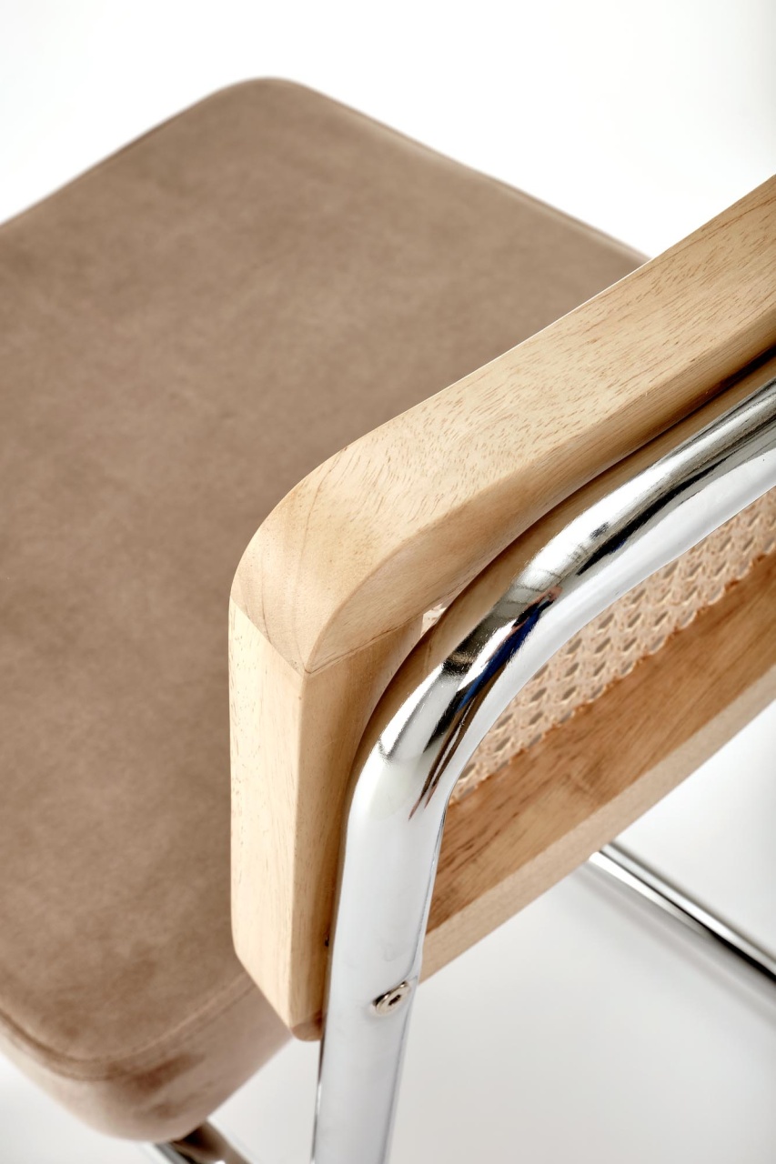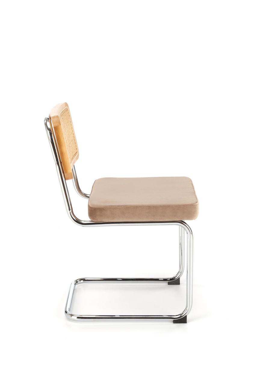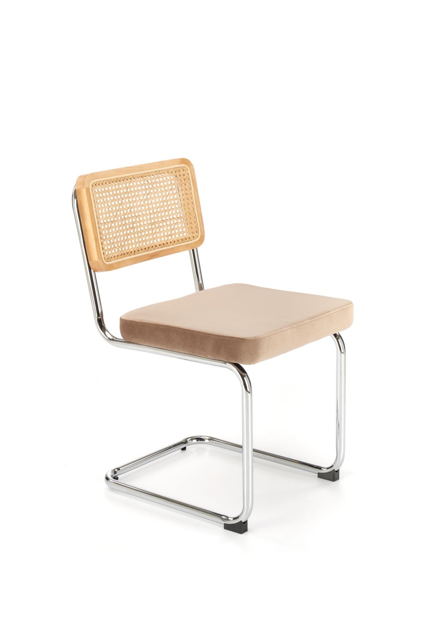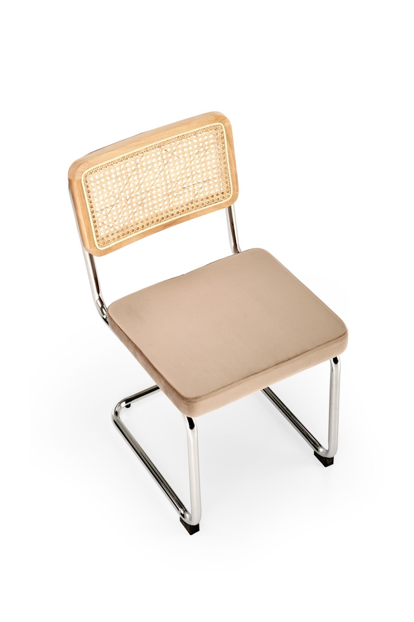 Scaun K504 ratan natural - velvet bej Scaunul K504 are un design excelent pentru interioare moderne. Ratanul sintetic si picioarele de otel sunt o combinatie excelenta cu un design minimalist, fara a-i lipsi eleganta. Baza scaunului din otel este solida astfel ca scaunul este stabil si durabil. Dimensiuni: 53 60 84 49 Latime: 53 cm Adancime: 60 cm Inaltime totala: 84 cm Inaltime pana la sezut: 49 cm Culoare : Natural - Bej Produsul nu este montat. Instructiunile de montaj se gasesc in colet.