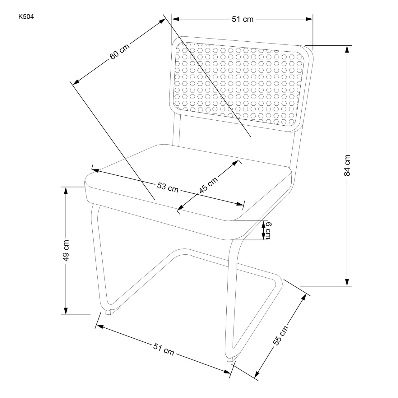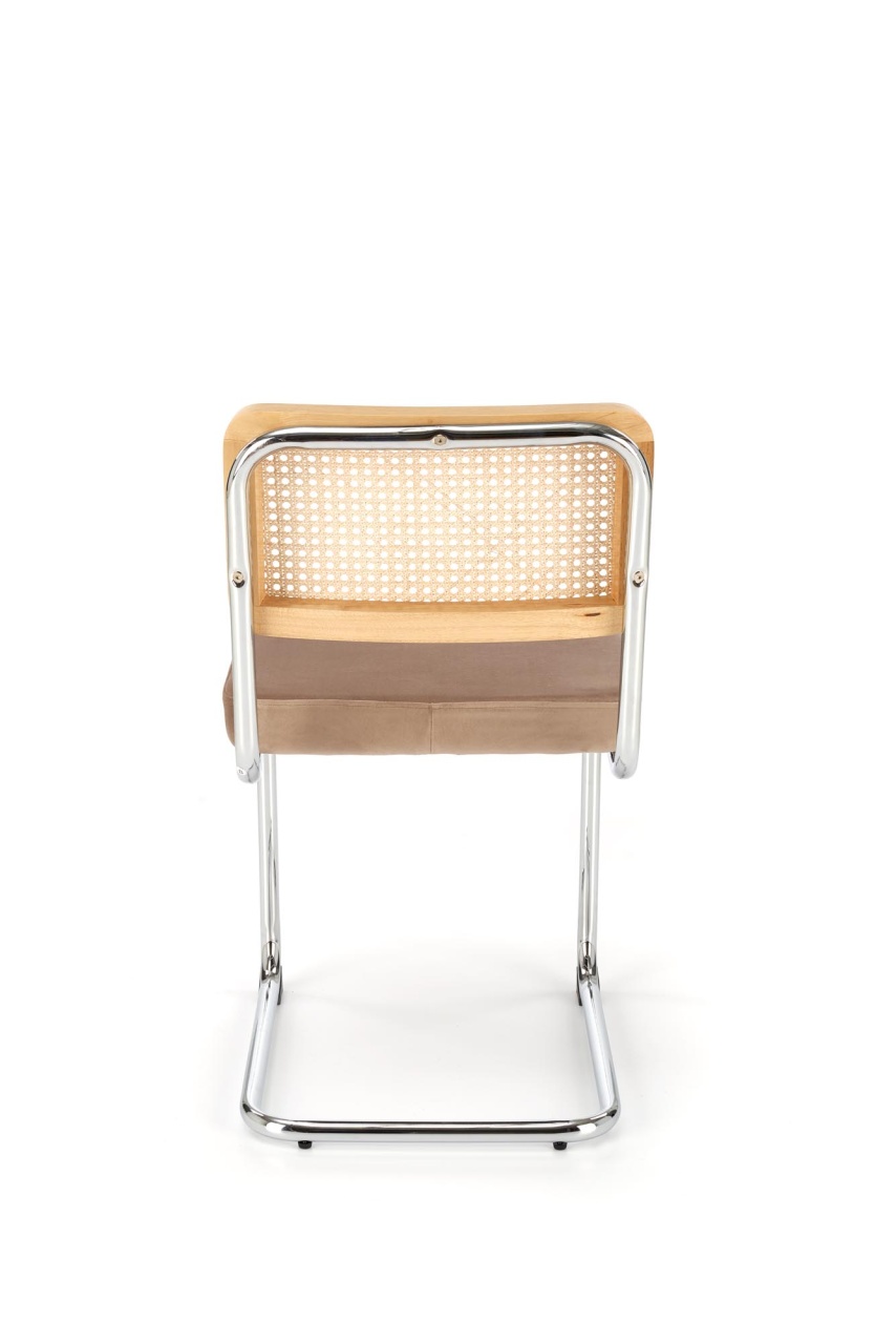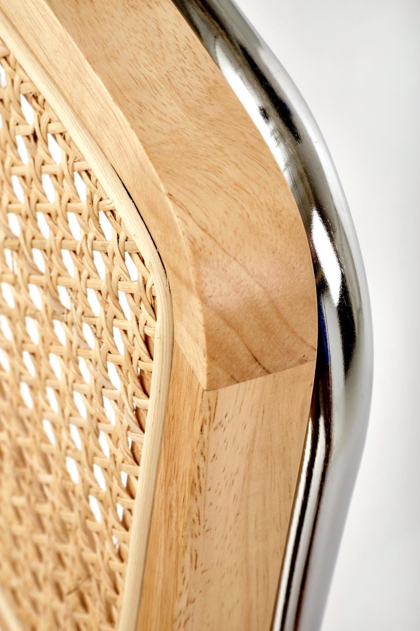 Scaun K504 ratan natural - velvet bej Scaunul K504 are un design excelent pentru interioare moderne. Ratanul sintetic si picioarele de otel sunt o combinatie excelenta cu un design minimalist, fara a-i lipsi eleganta. Baza scaunului din otel este solida astfel ca scaunul este stabil si durabil. Dimensiuni: 53 60 84 49 Latime: 53 cm Adancime: 60 cm Inaltime totala: 84 cm Inaltime pana la sezut: 49 cm Culoare : Natural - Bej Produsul nu este montat. Instructiunile de montaj se gasesc in colet.