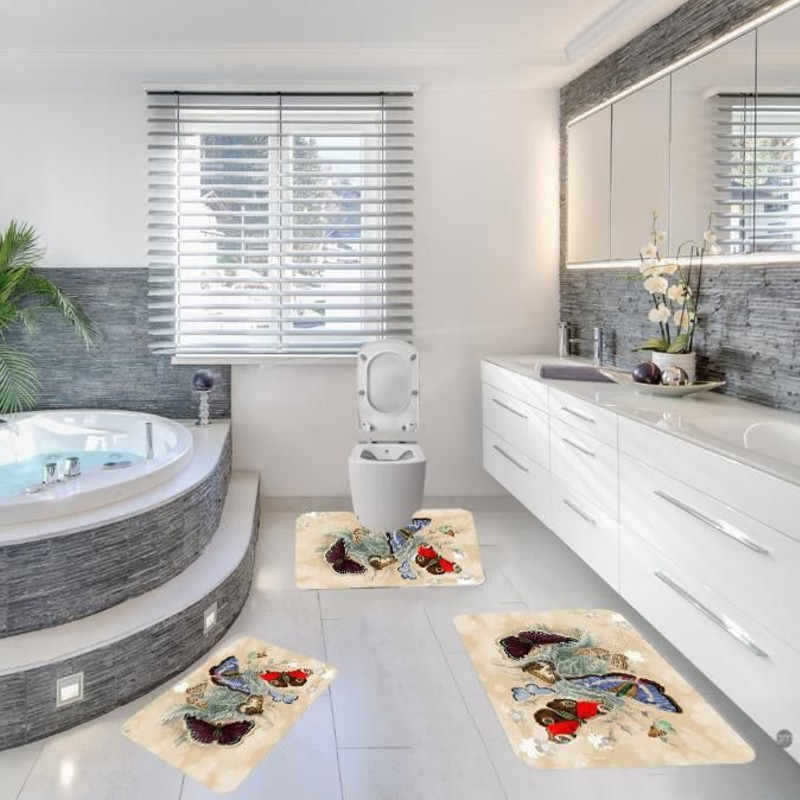Set 3 covorase antiderapante de baie Setul de covoare pentru baie este antistatic, absorbant si usor de intretinut. Cu suport anti-alunecare, asigura o iesire fara riscuri din cada de baie. Covorasul pentru suportul de la chiuveta va ofera caldura si confort. Pachetul include: 1 covoras pentru baie, 100 x 60 cm 1 covoras pentru suportul de la chiuveta, 50 x 60 cm 1 covoras pentru WC, 50 x 60 cm Intretinere produs: Poate fi curat foarte usor cu aspiratorul Poate fi curatat prin stergere cu spuma unui amestec din apa cu detergent Poate fi spalat chimic la masini speciale insa fara a fi folositi inalbitori Dupa curatare covorul se lasa la uscat, dar nu se expune in lumina directa a soarelui Nu se foloseste fierul de calcat