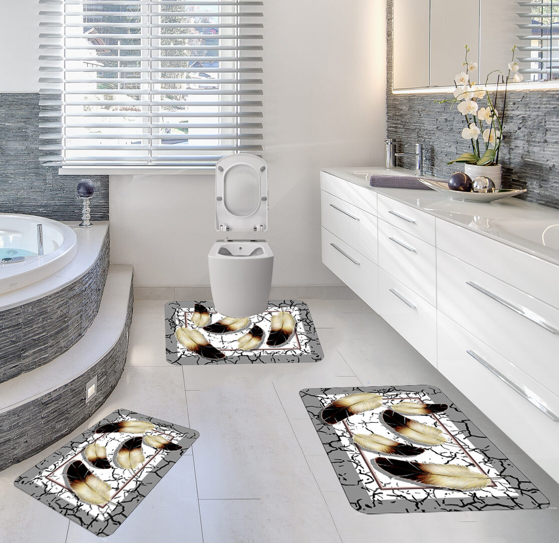 Set 3 covorase antiderapante de baie, Feather Setul de covoare pentru baie este antistatic, absorbant si usor de intretinut. Cu suport anti-alunecare, asigura o iesire fara riscuri din cada de baie. Covorasul pentru suportul de la chiuveta va ofera caldura si confort. Pachetul include: 1 covoras pentru baie, 100 x 60 cm 1 covoras pentru suportul de la chiuveta, 50 x 60 cm 1 covoras pentru WC, 50 x 60 cm Intretinere produs: Poate fi curat foarte usor cu aspiratorul Poate fi curatat prin stergere cu spuma unui amestec din apa cu detergent Poate fi spalat chimic la masini speciale insa fara a fi folositi inalbitori Dupa curatare covorul se lasa la uscat, dar nu se expune in lumina directa a soarelui Nu se foloseste fierul de calcat