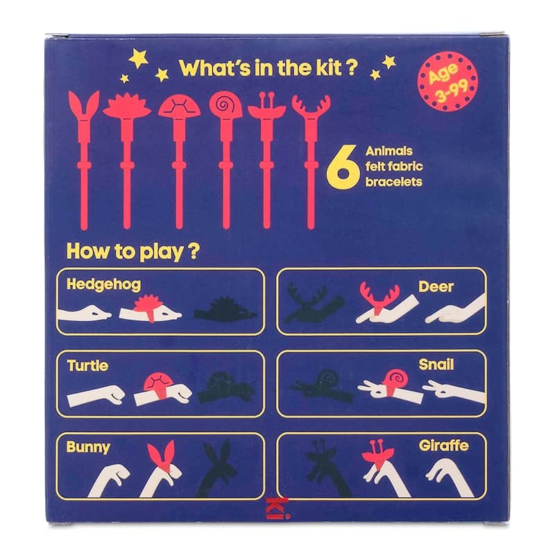 Teatru de umbre , Bratari cu animale din fetru Set cu 6 bratari colorate din fetru cu animale: arici, broasca testoasa, melc, iepuras, girafa, caprioara. Materiale: fetru certificat, sigur pentru copii Varsta recomandata: 3+ ani Avertisment: Nerecomandat sub 3 ani , piese mici (pericol de sufocare)