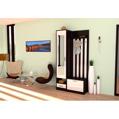 Dimensiuni (l x h x a): 1000 x 2006 x 364 mm Culoare: WENGE cu fildes. Descriere: Placa intreaga de PAL pe spate (cuier), polita in partea de sus si pantofar cu suporti metalici cu 2 spatii de depozitare. Usa se poate monta pe partea stanga ori pe partea dreapta, oglinda pe usa, polite pe interior si sertar in partea de jos. Materiale folosite: Carcasa din pal melaminat, suporti metalici, glisiere metalice sertar si oglinda. Nota: Schita de montaj nu se afla in interiorul coletului intre piesele de mobila. Schita de montaj o sa fie atasata pe spatele facturii.