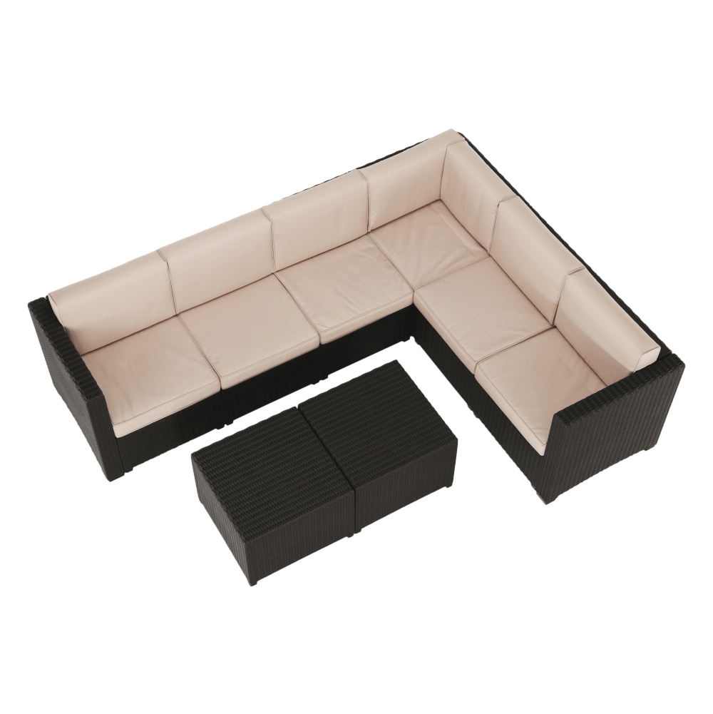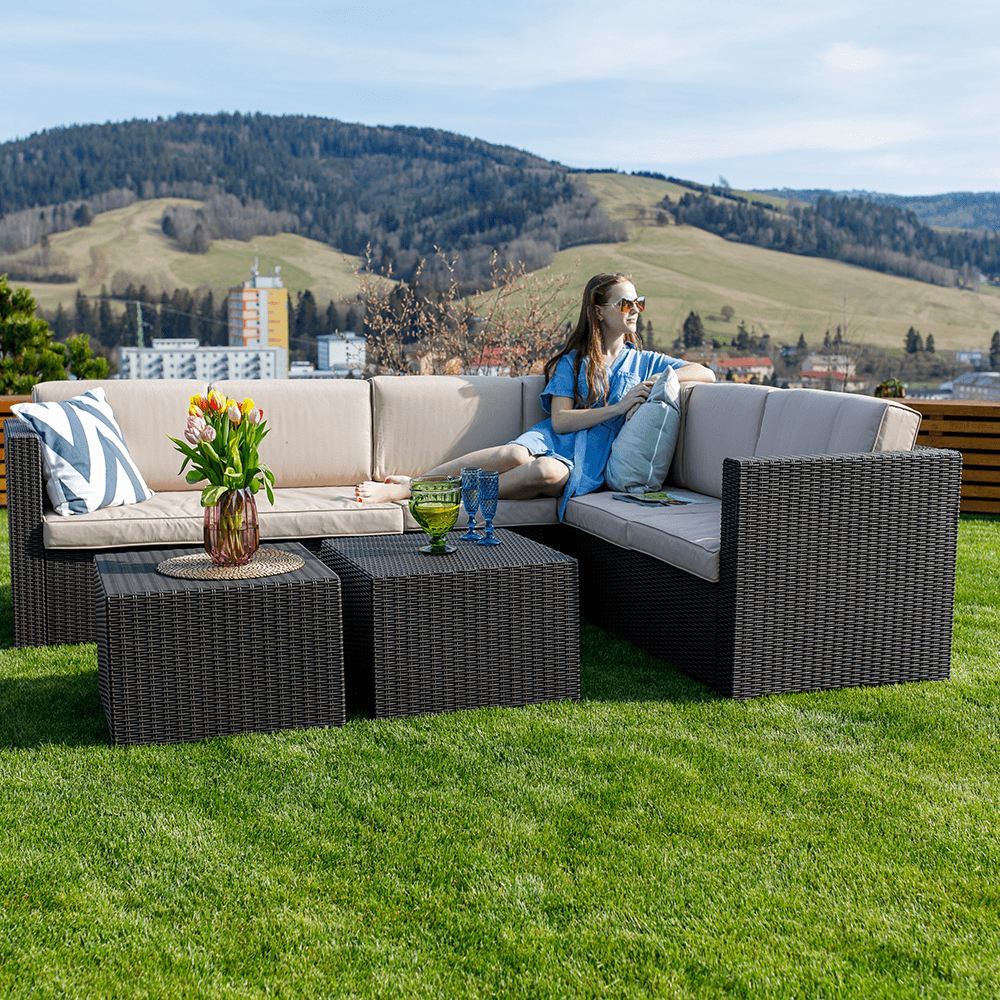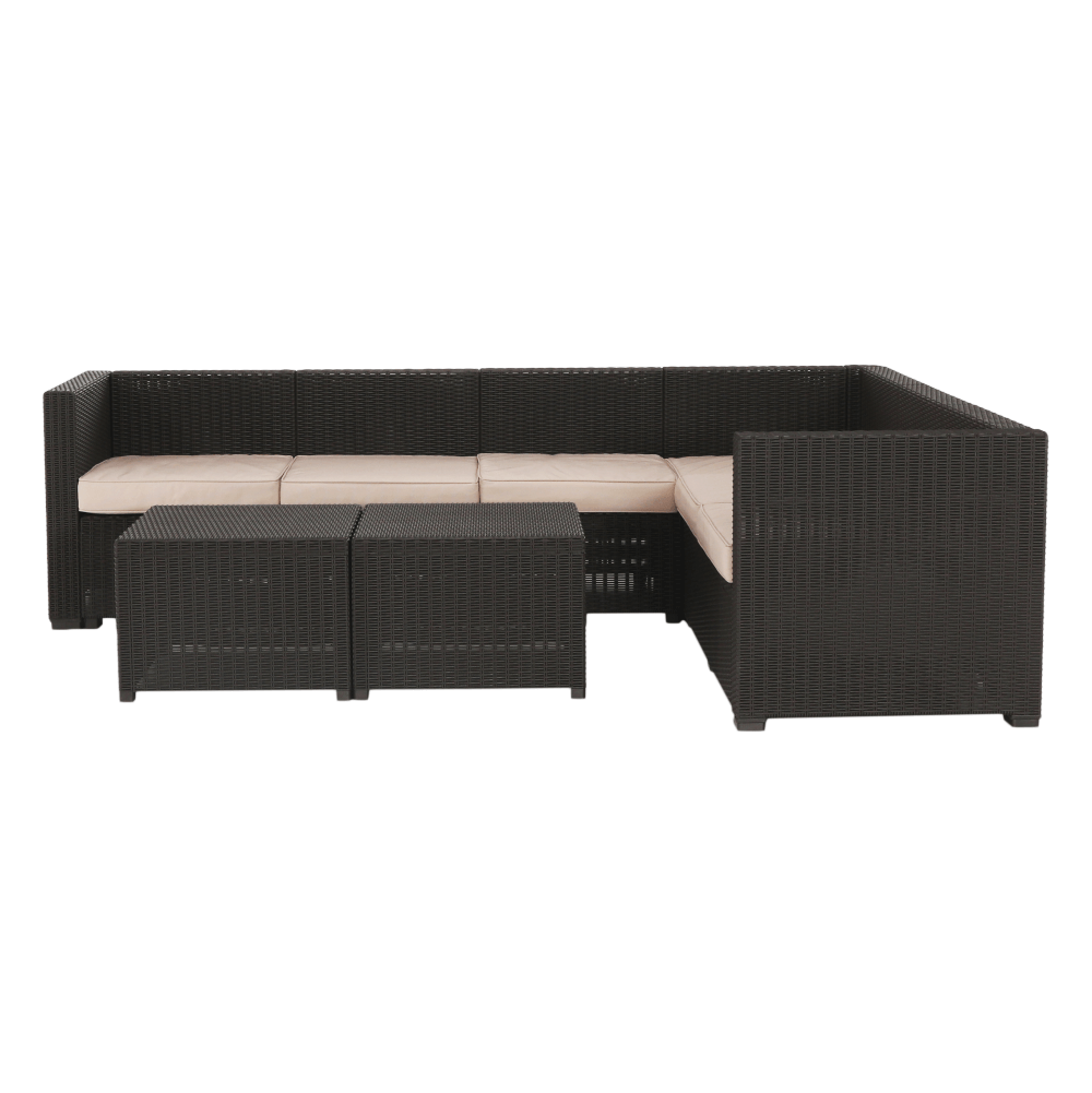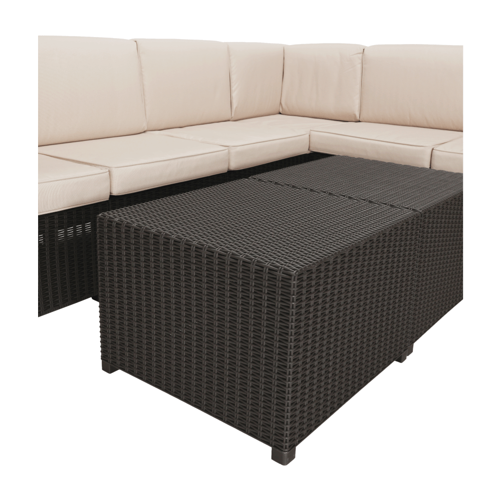 Material: ratan artificial/tesatura/spumaRezistenta materialului: 95 000 MartindaleCuloare: maro/bejDimensiuni colt (LxGxI): 246,6/190,6x69,5x67,5/80 cmInaltimea sezutului: 41,5 cmAdancimea sezutului: 51 cmDimensiuni masa (LxGxI): 56x56x40 cmGrosimea pernei: 9 cmSet din 3 pieseCu perne2 masute de cafea