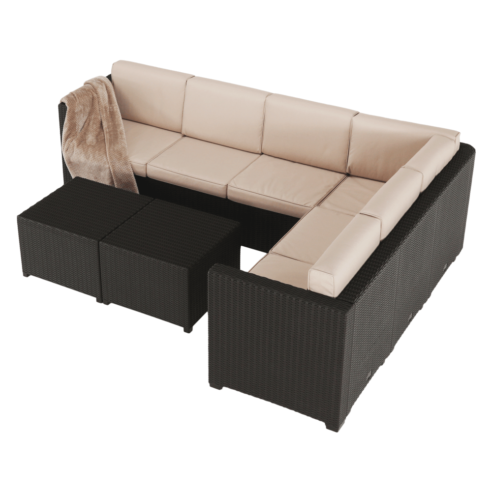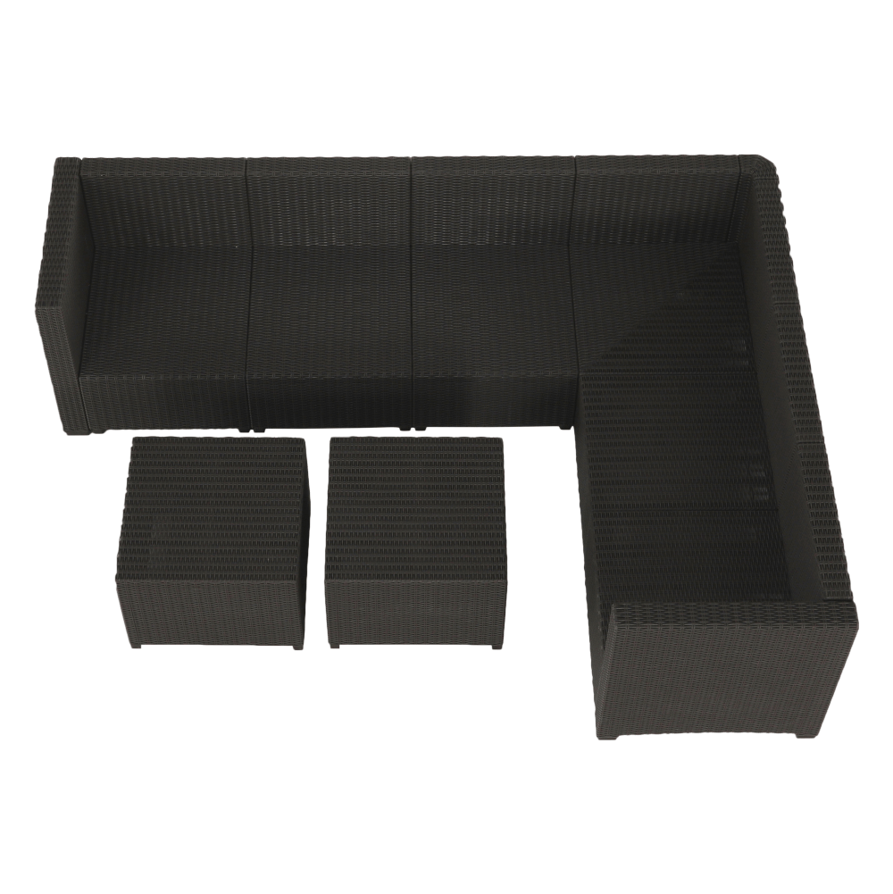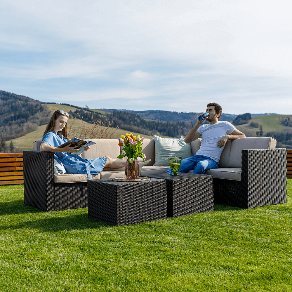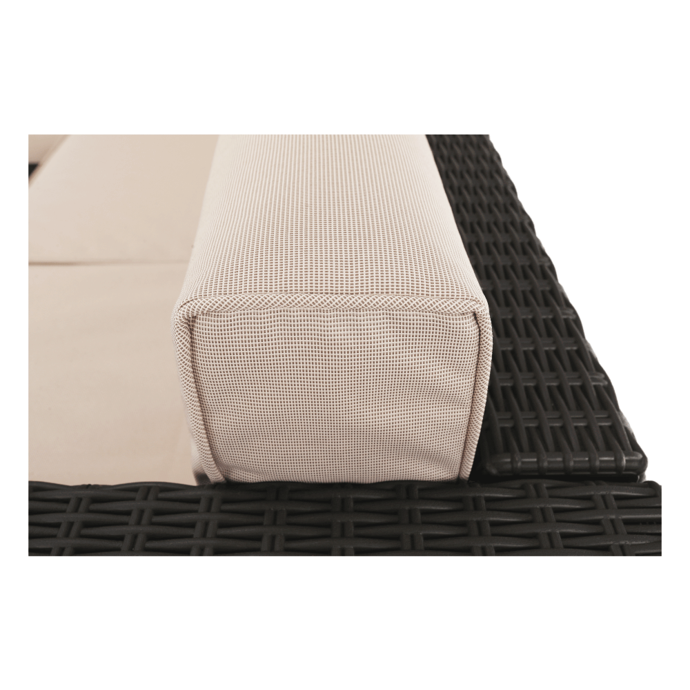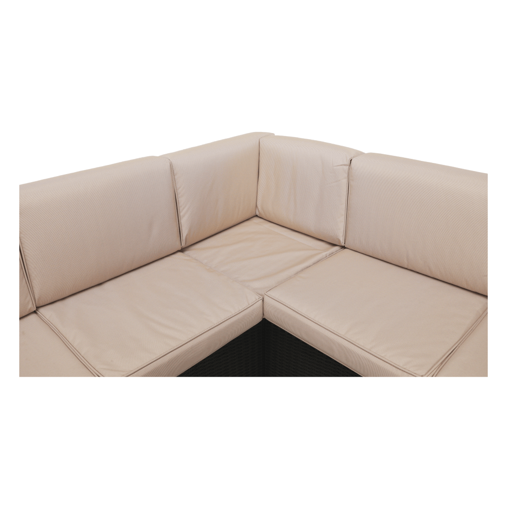Material: ratan artificial/tesatura/spumaRezistenta materialului: 95 000 MartindaleCuloare: maro/bejDimensiuni colt (LxGxI): 246,6/190,6x69,5x67,5/80 cmInaltimea sezutului: 41,5 cmAdancimea sezutului: 51 cmDimensiuni masa (LxGxI): 56x56x40 cmGrosimea pernei: 9 cmSet din 3 pieseCu perne2 masute de cafea