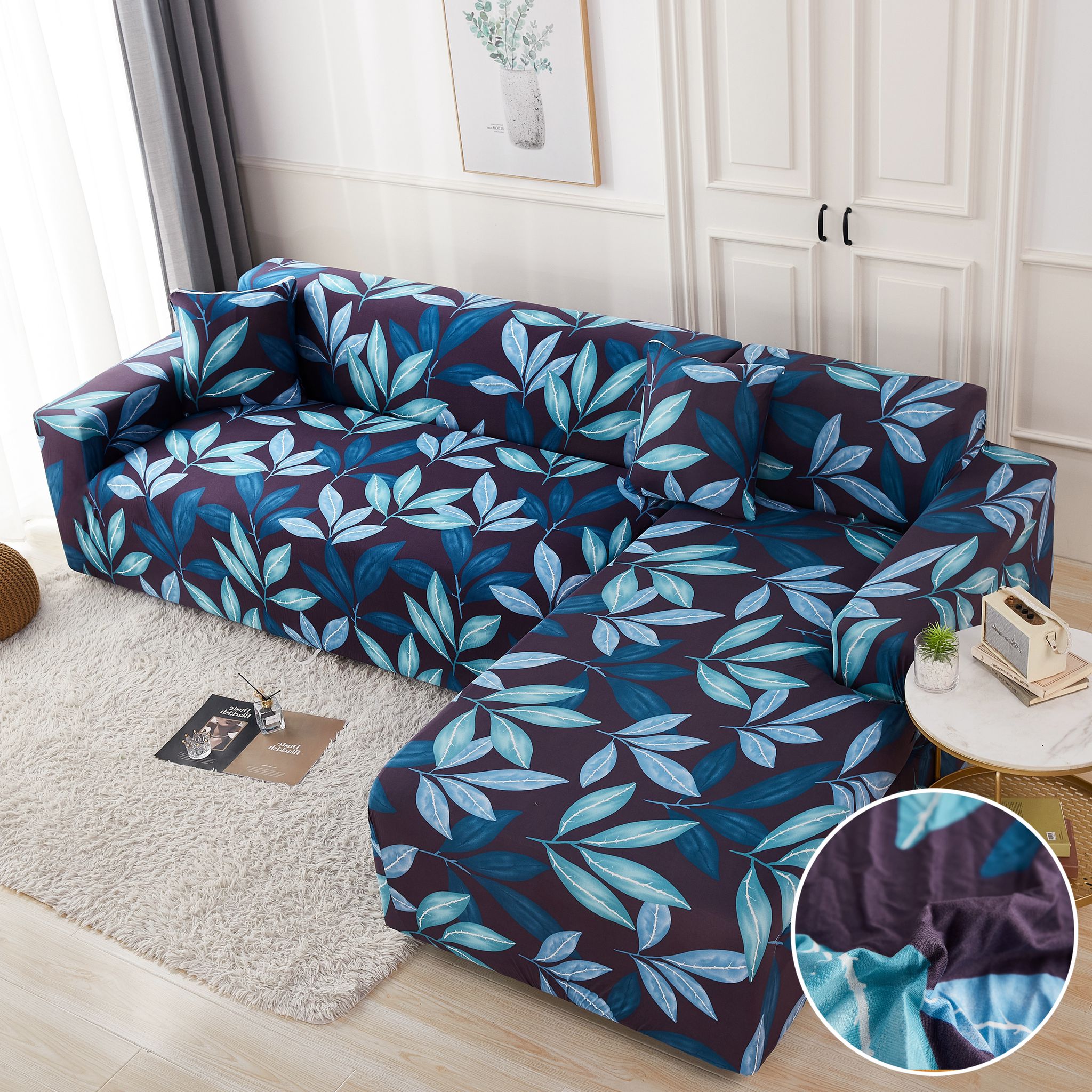 Set husa pentru coltar M + L, Elastica, Jojo Home, Albastru, frunze