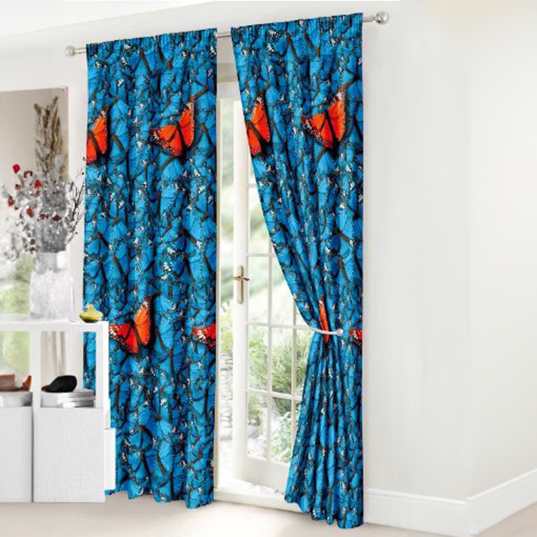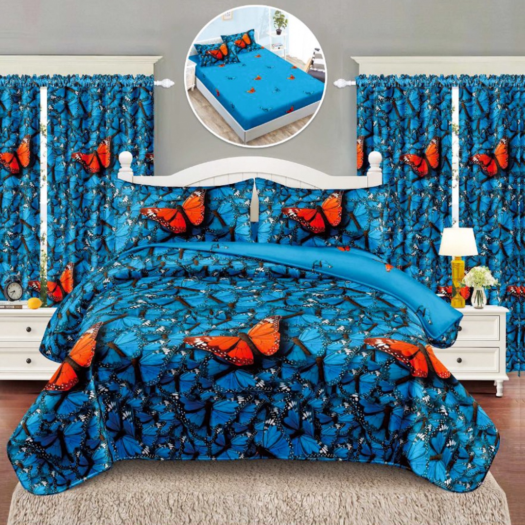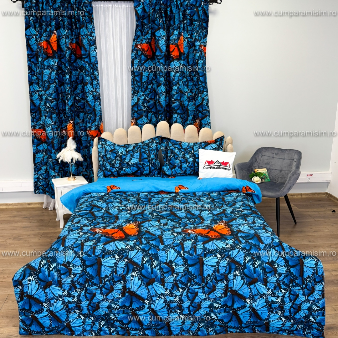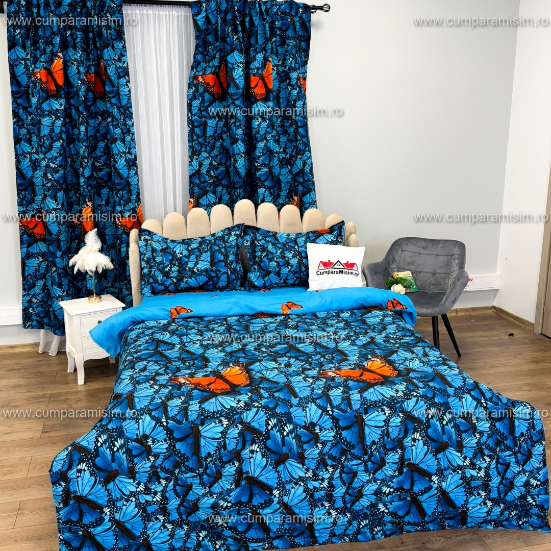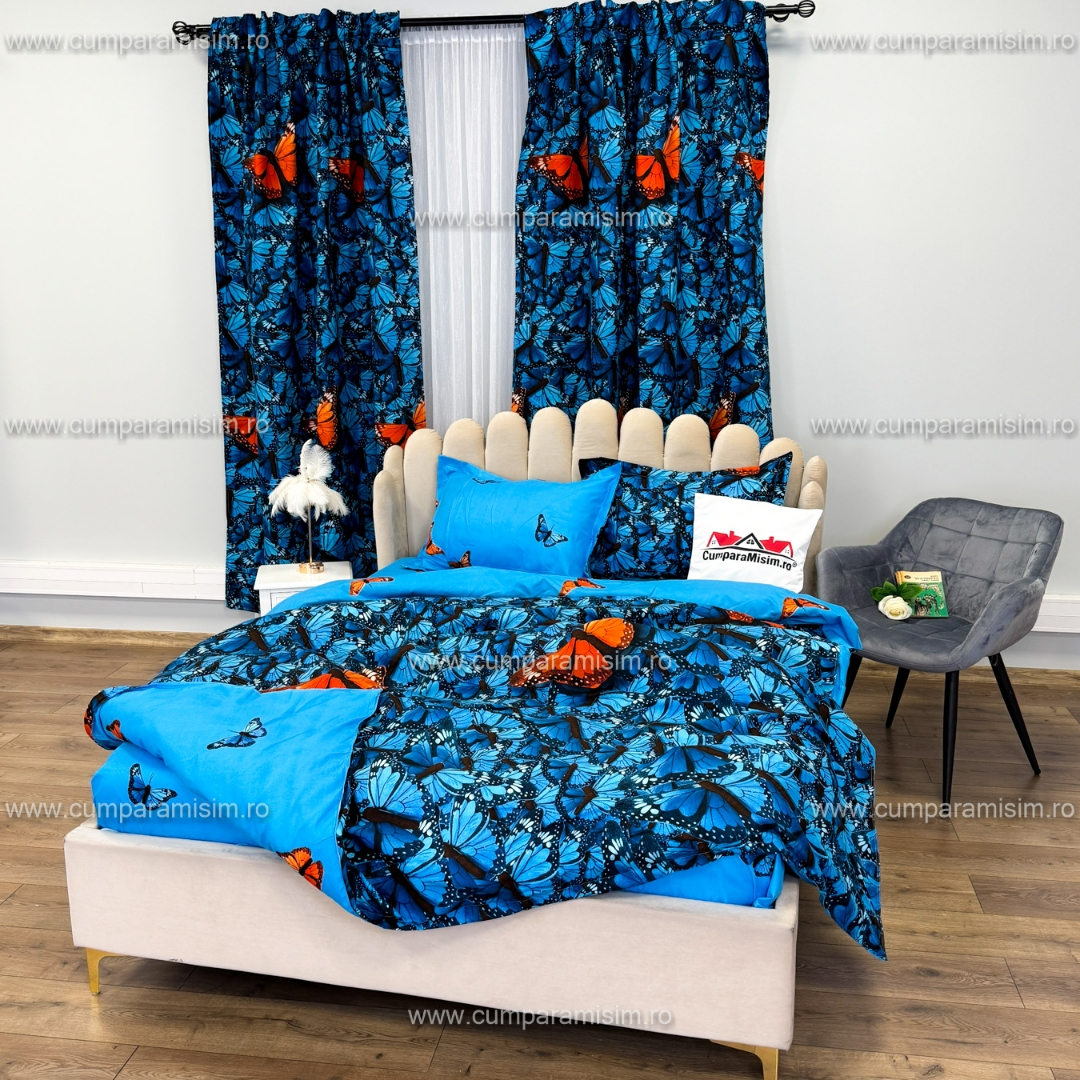 Set Lenjerie pat dublu cu Elastic (140x200cm) + 2 draperii, finet, 6 piese, Albastru, Fluturi