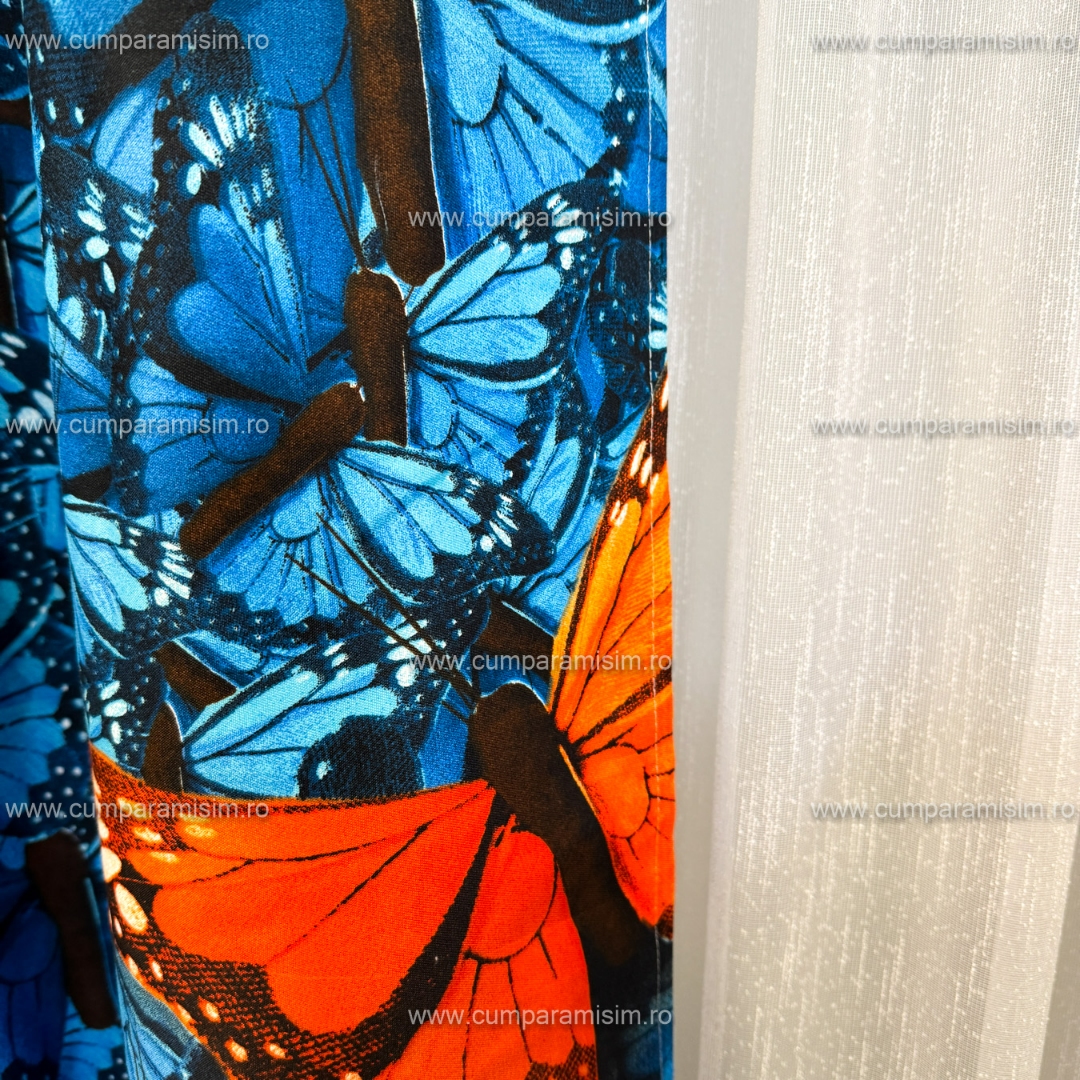 Set lenjerie de pat Matrimonial Compact (saltea 140x200 cm, pilota 160x200 cm) din bumbac finet, 6 piese, cu draperii incluse – Model fluturi Iti prezentam un set complet de lenjerie de pat din finet, format din 8 piese, inclusiv 2 draperii cu rejansa multifunctionala  pentru o fixare usoara pe bara, dar si pe sina . Acest set unic are un design elegant si rafinat, care se regaseste atat pe lenjeria de pat, cat si pe draperii, oferind o armonie vizuala perfecta in dormitorul tau. Detal