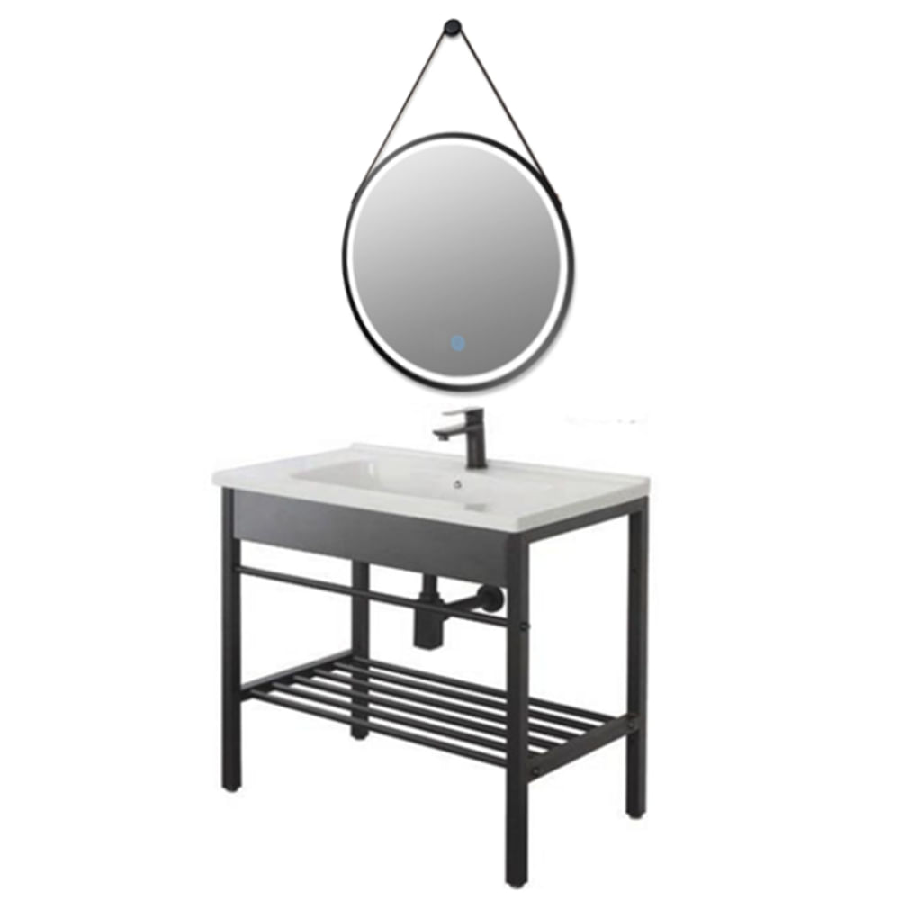 Set Chiuveta Baie Complet – Design Modern, Materiale Premium si Functionalitate AvansataDescriere Produs:Adauga un plus de eleganta si functionalitate baii tale cu acest set complet de chiuveta, ideal pentru un design modern si practic. Setul include o chiuveta spatioasa din ceramica, un suport metalic solid, o baterie de lavoar ergonomica, sifon de scurgere si o oglinda cu LED rotunda cu margine metalica neagra si chinga de piele ecologica.✅ Design modern si versatil – Potrivit pentru orice tip de baie, oferind un aspect aerisit si organizat.✅ Functionalitate maxima – Suportul metalic include un raft practic pentru depozitare si un suport pentru prosoape, asigurand o baie ordonata.✅ Picioare reglabile – Permit ajustarea suportului pentru a compensa eventualele denivelari ale podelei.✅ Spatiu generos pentru utilizare – Chiuveta ofera suficient loc pentru spalarea eficienta a mainilor si a diverselor articole.✅ Materiale premium – Chiuveta din ceramica cu finisaj lucios este rezistenta la zgarieturi si usor de curatat, iar cadrul din otel inoxidabil vopsit negru este anti-rugina si rezistent la umiditate.✅ Control optim al apei – Bateria ergonomica permite reglarea temperaturii datorita furtunurilor incluse pentru apa calda si rece.Dimensiuni:? Chiuveta: 60 cm (L) x 47 cm (l) – spatioasa si confortabila in utilizare? Oglinda: Diametru 60 cm – ofera vizibilitate optima si amplifica luminozitatea baii? Inaltime ansamblu chiuveta + suport: 84 cm – ideala pentru utilizare comodaPachetul include:✔️ 1 x chiuveta ceramica rezistenta✔️ 1 x suport metalic cu raft de depozitare si suport pentru prosoape✔️ 1 x baterie lavoar + furtunuri apa calda/rece✔️ 1 x sifon de scurgere✔️ 1 x oglinda cu LED actionata cu buton touch, cu margine metalica neagra si chinga de piele neagra./nAcest set de chiuveta reprezinta solutia perfecta pentru baile moderne, combinand stilul elegant, durabilitatea materialelor si functionalitatea inteligenta! ?✨
