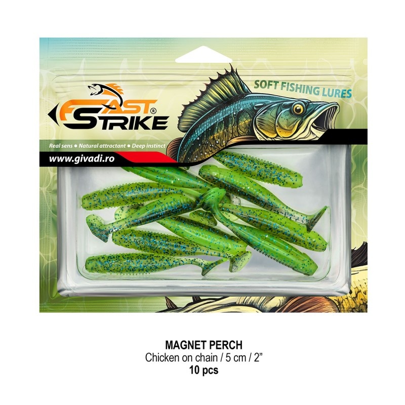 Fast Strike Magnet Perch 5 cm este o nălucă soft ultra-eficientă, creată pentru pescuitul la biban, șalău, știucă și avat, mai ales în zilele când rapitorii sunt apatici. Coada supradimensionată în formă de bănuț generează o vibrație agresivă și irezistibilă, transformând această nălucă într-un adevărat magnet pentru atacuri. Datorită materialului premium, moale dar rezistent, năluca își păstrează forma și flexibilitatea chiar și după multe capturi. Modelul este impregnat cu un atractant exclusiv Fast Strike, eficient în ape limpezi, tulburi sau slab luminate. Magnet Perch este ideală pentru lacuri, râuri, canale și baraje, fiind una dintre cele mai versatile și prinzătoare naluci din gama Fast Strike. Ambalarea în blister rigid + punguță resigilabilă menține forma perfectă și previne deformarea în timpul transportului și depozitării. ⭐ Caracteristici: ? Tip: nălucă soft (shad) ? Lungime: 5 cm ⚖️ Greutate: 1.6 g ? Coada tip bănuț – vibrație agresivă, mișcare realistă ? Material premium – moale, durabil, rezistent la UV ? Impregnată cu atractant personalizat Fast Strike ? Ideală pentru lacuri, râuri, canale, baraje ? Culoare: Chicken On Chain ? Ambalare: blister rigid + tavă + punguță cu fermoar ? Conținut: 10 buc/blister
