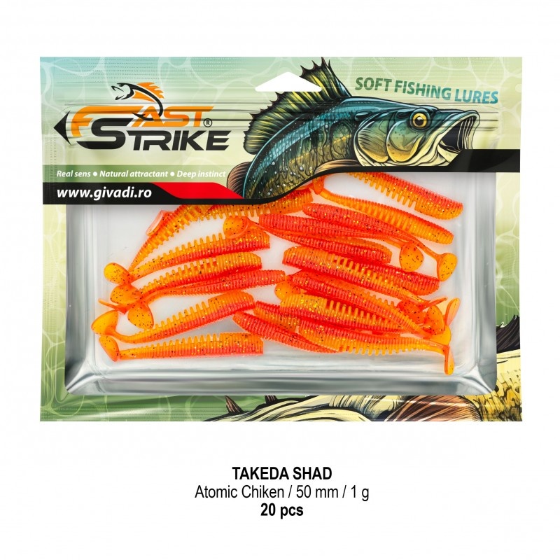 Fast Strike Takeda Shad 5 cm / 1 g este o nălucă soft extrem de atractivă, concepută special pentru pescuitul la rapitori precum biban, șalău, știucă sau avat. Forma corpului, împreună cu coada supradimensionată de tip paletă, generează o vibrație intensă și mișcări irezistibile, care provoacă atacul chiar și în cele mai dificile condiții. Striațiile de pe burtă produc o oscilație naturală, imitând perfect peștii pradă, iar la mici impulsuri din vârful lansetei, naluca eliberează bule fine de aer, un detaliu care păcălește inclusiv cei mai suspicioși rapitori. Realizate dintr-o mixtură specială de silicon moale, shad-urile sunt rezistente la razele UV, la vegetație și la contactul cu pietriș sau crengi submerse. Sunt impregnate cu miros atractiv și ambalate în plic cu fermoar + tavă rigidă, pentru a-și păstra forma perfectă în timp. ⭐ Caracteristici: ? Tip nălucă: shad soft ? Model: Fast Strike Takeda Shad ? Lungime: 5cm ⚖️ Greutate: 1g ? Coada de tip paletă – vibrație intensă și atractivă ? Striații pe burtă – imitație realistă + eliberare de bule de aer ? Material: silicon moale, flexibil, rezistent la UV ? Aroma: miros atractiv pentru rapitori ? Culoare: Atomic Chiken 03 ? Ambalaj: 20 buc / plic ? Ideală pentru biban, șalău, știucă, avat