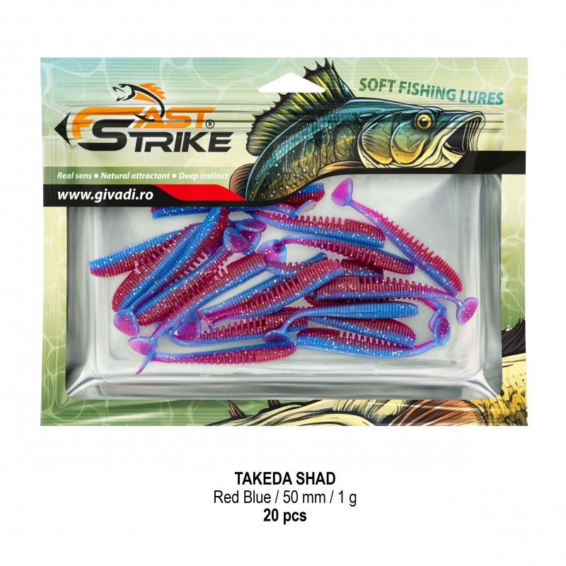 Fast Strike Takeda Shad 5 cm / 1 g este o nălucă soft extrem de atractivă, concepută special pentru pescuitul la rapitori precum biban, șalău, știucă sau avat. Forma corpului, împreună cu coada supradimensionată de tip paletă, generează o vibrație intensă și mișcări irezistibile, care provoacă atacul chiar și în cele mai dificile condiții. Striațiile de pe burtă produc o oscilație naturală, imitând perfect peștii pradă, iar la mici impulsuri din vârful lansetei, naluca eliberează bule fine de aer, un detaliu care păcălește inclusiv cei mai suspicioși rapitori. Realizate dintr-o mixtură specială de silicon moale, shad-urile sunt rezistente la razele UV, la vegetație și la contactul cu pietriș sau crengi submerse. Sunt impregnate cu miros atractiv și ambalate în plic cu fermoar + tavă rigidă, pentru a-și păstra forma perfectă în timp. ⭐ Caracteristici: ? Tip nălucă: shad soft ? Model: Fast Strike Takeda Shad ? Lungime: 5cm ⚖️ Greutate: 1g ? Coada de tip paletă – vibrație intensă și atractivă ? Striații pe burtă – imitație realistă + eliberare de bule de aer ? Material: silicon moale, flexibil, rezistent la UV ? Aroma: miros atractiv pentru rapitori ? Culoare: Red Blue 05 ? Ambalaj: 20 buc / plic ? Ideală pentru biban, șalău, știucă, avat