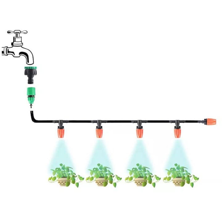 Sistem automatizat pentru Irigare 15 Metri Kit Complet irigare pentru Plante si flori naturale Picuratori Reglabili si Accesorii pentru Gradina de Vis Acest sistem de irigare automatizat este alegerea perfecta pentru mentinerea plantelor si florilor sanatoase, fara efort suplimentar. Potrivit pentru gradini, sere, terase si ghivece suspendate, sistemul asigura o distributie uniforma a apei, reducand risipa si economisind timp. Acest kit complet elimina udarea manuala si asigura un mediu ideal pentru cresterea sanatoasa a plantelor. Distributie precisa a apei: Picuratorii ofera o irigare uniforma si eficienta pentru fiecare planta. Economie de timp si resurse: Sistemul automatizat reduce consumul de apa si minimizeaza necesitatea interventiei manuale. Materiale rezistente: Furtunul este flexibil, rezistent la UV si conceput sa dureze in timp. Instalare simpla: Kitul include tot ce ai nevoie Furtun de 10M, adaptor rapid, conectori Tee Picuratori si suporturi fixe, eliminand necesitatea altor unelte. Perfect pentru orice tip de gradina, de la flori si legume la plante suspendate si zone greu accesibile. Acest sistem iti ofera control complet asupra procesului de irigare, astfel incat fiecare planta primeste cantitatea exacta de apa necesara pentru o dezvoltare optima.