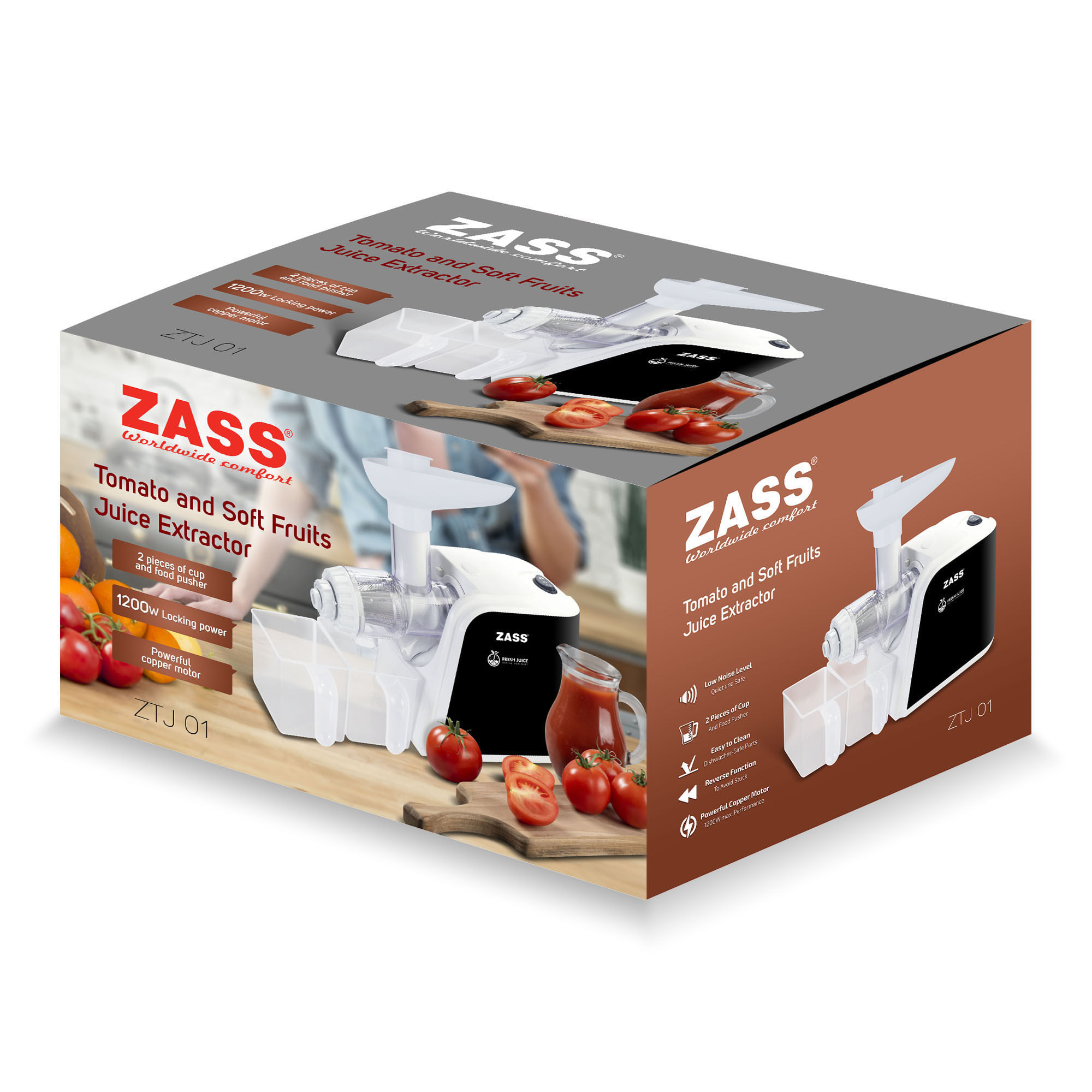 /n/n/nStorcator de rosii si fructe moi ZASS ZTJ 01, 1200 W, Functie reverse, Include 2 recipiente plastic si dispozitiv impingere alimente, Negru-Alb/n/n/n/n/n/n/nMotor puternic din cupru/nCu o putere putere nominala 500 W şi putere maxima de 1200 W motorul asigura un cuplu foarte mare necesar stoarcerii fructelor şi legumelor./n/n/nAccesorii/nInclude 2 recipiente plastic si dispozitiv impingere alimente/n/n/nFunctie reverse/nFunctie reverse, pentru a inversa sensul rotatiei melcului./n/n/n/n/n/n/nDemontare uşoara/nAparatul are in componenta materiale durabile fara BPA. Se pot demonta şi curata uşor./n/n/nIdeal pentru fructe şi legume/nSe poate obtine suc din fructe sau legume. Sucul este plin de nutrienti, vitamine şi minerale./n/n/n/n/n/n/n/n/n/n/n /n/n/n/n