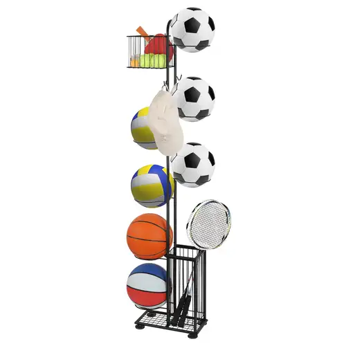 Suport pentru mingi, Negru, Metal, 155 cm suport mingi multisport material: metal dimensiuni: 155 cm greutate: 2,5 kg asamblare simpla Suportul multifunctional pliabil pentru echipament sportiveste un instrument practic pentru cluburile sportive si pentru acasa. In suport puteti depozita mingi de sport, rachete de sport, bate de baseball si multe altele de care aveti nevoie pentru antrenament. Standul pentru echipament sportiv este fabricat din metal, iar asamblarea sa este foarte simpla si rapida cu ajutorul suruburilor si a unei chei Allen, totul fiind inclus in pachet. Modelul include cinci suporturi reglabile pentru mingi de sport (nu este potrivit pentru mingi medicale grele) si o cusca pentru depozitarea altor echipamente sportive sau jucarii. Economisiti spatiu acasa sau in sala de sport cu suportul practic!