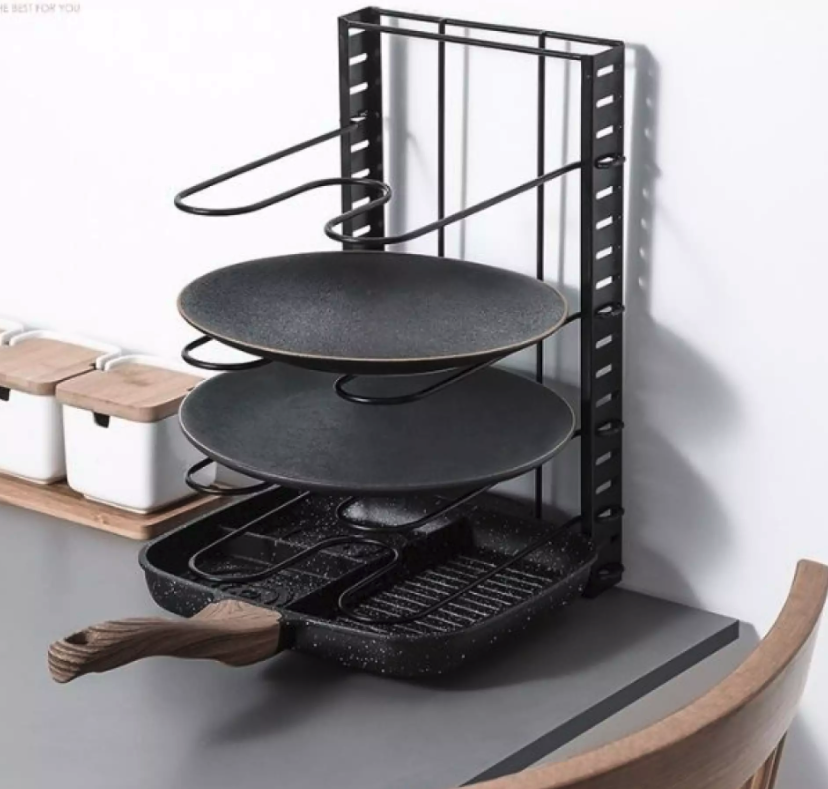 Suport reglabil pentru oale, capace si tocatoare Dimensiuni produs: 30 x 20 x 42 cm Culoare: negru Greutate: 1.5 kg 5 niveluri reglabile Suportul a fost conceput folosind metal de calitate premium si durabil, astfel incat pot fi depozitate tigaile fara ca suportul sa se indoaie. Suportul este, de asemenea, foarte stabil. Suportul a fost conceput pentru a va ajuta in organizarea tigailor, cratitelor, capacelor si tocatoarelor in 3 moduri. Datorita designului inteligent in forma de U a rafturilor, suportul poate tine cu usurinta toate tigaile, cratitele, capacele si tocatoarele. Este rapid si usor asamblat.