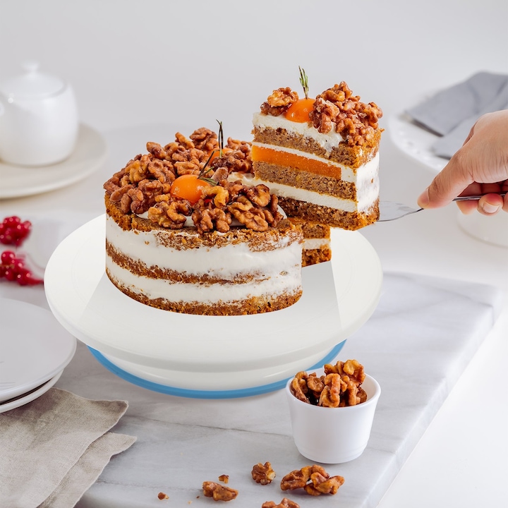 Suport rotativ pentru tort Culori disponibile: alb, roz, bleu platou rotativ pentru tort baza antiaderenta diametru 28 cm Decorarea unui tort este mult mai usoara atunci cand poti sa-l rotesti cu ajutorul unui platou, precum acesta. Vei putea sa aplici crema mai rapid, sa creezi si sa aplici decoratiunile mai usor. Baza antiaderenta a acestuia este confectionata dintr-un cauciuc moale, ce se va lipi de blatul dumneavoastra de bucatarie, eliminand incovenientul platourilor obisnuite. Te-ai saturat de torturile din comert si iti doresti sa realizezi chiar tu un tort delicios si aspectuos acasa? Pentru a obtine un tort delicios ai nevoie de ingrediente potrivite si de calitate, iar pentru a obtine un tort cu un aspect impecabil, ca de cofetarie, ai nevoie de instrumentele si ustensilele potrivite! Acesta suport rotativ pentru tort este realizat din materiale de calitate superioara, ceea ce inseamna ca-ti va fi un ajutor potrivit pentru mult timp. Vestile bune nu se termina aici deoarece mai trebuie sa-ti spunem si faptul ca acest set poate fi spalat atat manual, cat si in masina de spalat vase.
