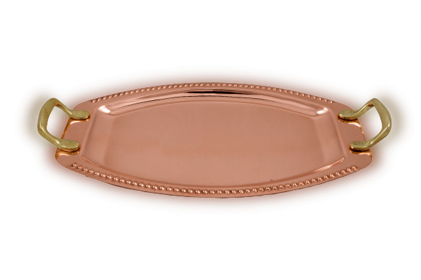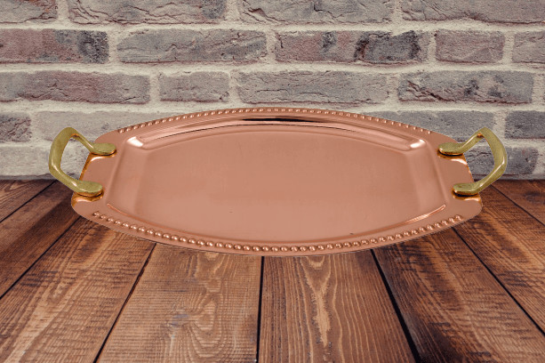 Tava Ovala din Cupru pentru Servit cu Manere din Bronz, Nr.2, 40x27cm, este accesoriul ideal atunci cand vrei sa servesti cu stil si sa adaugi un accent elegant in decor. O poti folosi pentru a servi cafea traditionala greceasca sau turceasca, ceai, bauturi sau cocktailuri, dar si pentru a organiza obiecte mici sau ca piesa centrala pe masa ori pe un bufet. Cele doua manere solide din bronz asigura un transport confortabil si sigur, iar cuprul lucios aduce stralucire in orice incapere. ✅ Functionalitate Tava ovala pentru servire din cupru cu manere Nr.2 poate fi folosita pentru a servi oaspetii, pentru a organiza obiecte mici si pentru decor. Este perfecta pentru servirea cafelei tradiționale grecesti sau turcesti, a ceaiului, bauturilor sau cocktailurilor. Poate fi folosita ca piesa centrala in aranjamente de masa, adaugand stralucire si eleganta. Manerele din bronz sunt solide si permit un transport usor si in siguranta al cestilor, paharelor sau sticlelor. Potrivita atat pentru uz casnic, cat si profesional in cafenele traditionale, pub uri, bar uri, taverne si restaurante cu atmosferă vintage. ? Utilizare si dimensiuni Dimensiuni: Lungime interioara: 30 cm Latime interioara: 21 cm Lungime: 40 cm Latime: 27 cm Lungime cu manere: 44,5 cm Inaltime: 1,5 cm Greutate: 840 gr Suprafata interioara de 30 x 21 cm este suficient de mare pentru un set de cafea, pahare sau mici platouri pentru servire. Lungimea totala cu manere de 44,5 cm ofera echilibru si priza buna la transport. Inaltimea de 1,5 cm asigura o margine discreta care stabilizeaza continutul, fara sa incarce vizual designul. ❤️ Traditie, calitate si stil Fabricata in Grecia, realizata integral manual, din cupru pur 100%, tava ovala pentru servire din cupru cu manere este de o calitate excelenta, cu durabilitate ridicata si poate dura o viata intreaga. Designul clasic si luciul cuprului completeaza perfect decorurile rustice, vintage sau moderne cu accente calde. Ofera un plus de eleganta pentru orice casa si este un cadou inspirat pentru prieteni sau familie care apreciaza obiectele deosebite pentru servire. Arata minunat atunci cand este asociata cu alte articole de cupru disponibile separat in magazinul nostru, creand un set coerent si premium. Lucrata manual. Durabila. Cupru curat. Manere din bronz. Potrivit pentru servirea cafelei, ceaiului sau a bauturilor. Perfecta pentru uz casnic si profesional. Daca iti doresti o tava din cupru care sa fie si practica la servire, si un obiect decorativ cu impact vizual, aceasta tava ovala cu manere din bronz, Nr.2, 40x27cm, este o alegere foarte buna pentru bucataria, livingul sau localul tau.