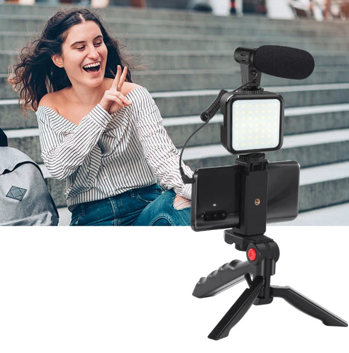 Trepied cu microfon si lumina pentru video, Kit AY-49 Kit video Vlogging / Streaming, trepied cu microfon si lumini Kit complet pentru vlogging,trepied,microfon, panou LED, telecomanda si suport reglabil pentru telefon. Kit vlogger Youtube, TikTok: Un kit de vlogging pentru iPhone sau orice smartphone usor de asamblat cu lumina LED, microfon, suport pentru telefon, telecomanda si trepied. Acest microfon accepta toate smartphone-urile care vin cu mufa de intrare audio de 3,5 mm. Iphone 7 si versiunile superioare trebuie sa utilizeze adaptor original de 3,5 mm-fulger. Adaptorul nu este inclus. Un trepied multifunctional care dispune de o telecomanda wireless incorporata detasabila si un suport pentru telefon inteligent/camera de actiune, impreuna cu un suport care ajuta la montarea tuturor elementelor incluse in acest kit, astfel incat sa va puteti conecta telefonul sau camera, aceasta este solutia dumneavoastra completa de video vlogging. Microfon profesional: Constructia durabila din aluminiu si designul fara baterie include un suport solid pentru a minimiza zgomotul de manipulare. Trepied portabil si de calitate: Picioarele flexibile ale trepiedului sunt realizate din ABS mai gros si conector complet din metal. Perfect pentru calatorii, selfie-uri, inregistrare video Youtube sau Tiktok. Lumina LED stralucitoare: reglabila. Functioneaza cu 2 baterii AA LR6 1.5V (nu sunt incluse in pachet). Suport pentru telefon cu rotatie de 360 de grade: tine in siguranta telefoane mobile si dispozitive cu latime intre 6 cm pana la 7 cm, in modul portret (vertical) sau peisaj (orizontal) Compact si portabil. Telecomanda Bluetooth, poate fi folosita si separat pentru declansarea fotografierii sau a filmarii pe telefonul dvs ! In sectiunea Bluetooth din setarile telefonului dvs apare ca AB Shutter3. Imperechere simpla si rapida. Buton Pornit-Oprit pe lateralul telecomenzii. Functioneaza cu o baterie Li de tip CR2032 (inclusa). Specificatii: Material: plastic Culoare: negru microfon - lungime 13,5 cm trepied – lungime 16 cm prindere telefon – interval 5,4 - 8,3 cm