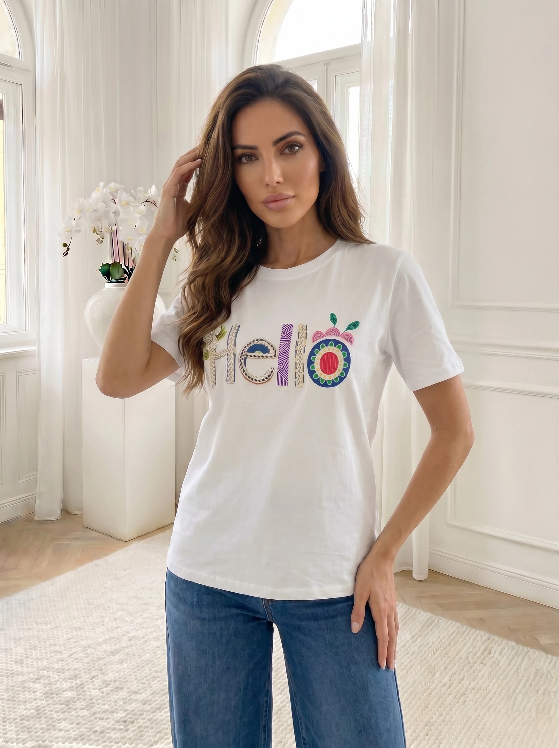 Tricou alb din bumbac cu imprimeu in relief Hello, alegerea perfecta pentru un look casual, modern si plin de optimism. Piesa se remarca prin textul „Hello” realizat cu un imprimeu in relief si aplicatii multicolore, oferind o nota jucausa si texturata