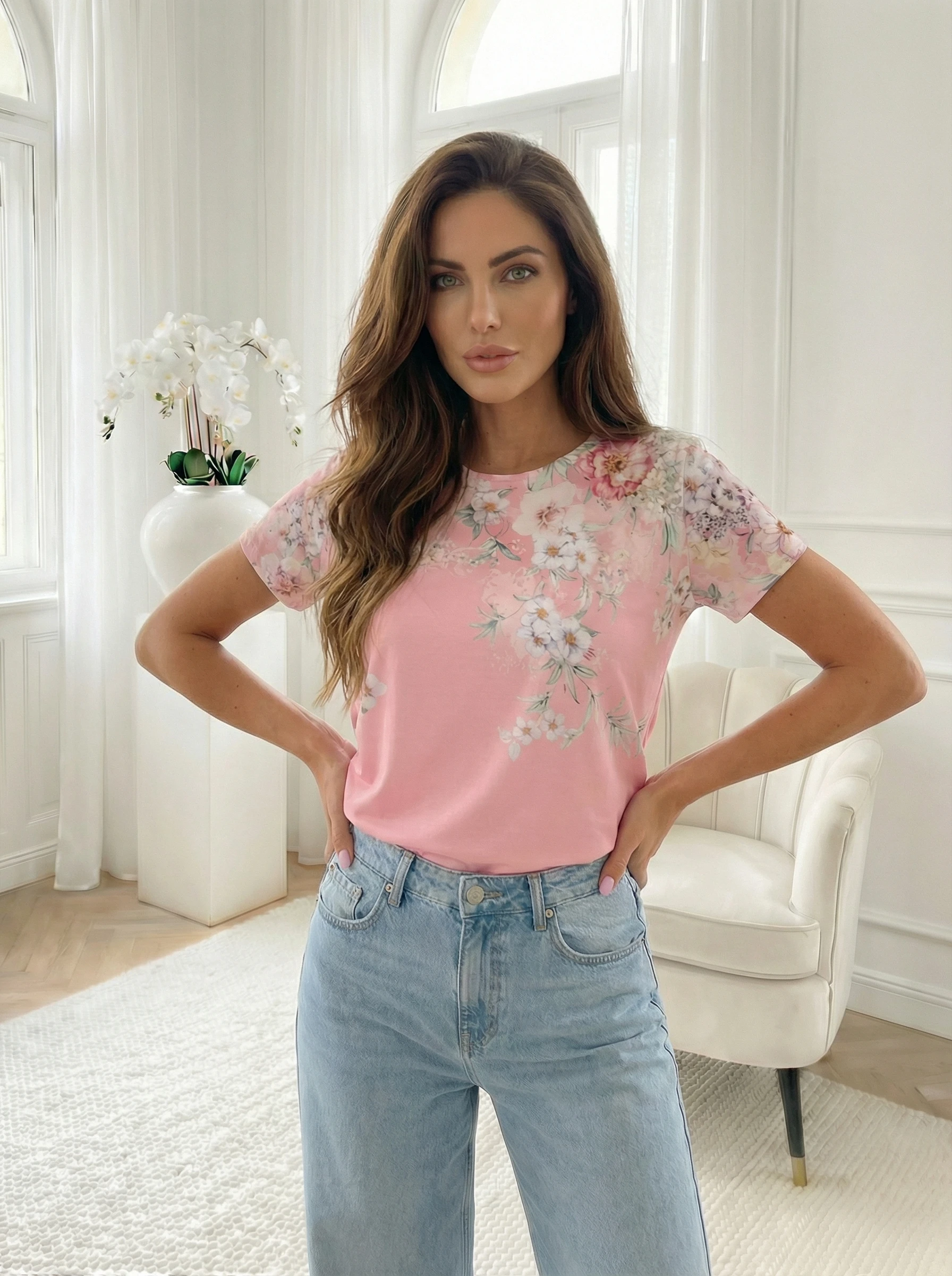 Tricou roz cu imprimeu floral pastel, realizat din material subtire si confortabil, potrivit pentru purtare zilnica. Designul cu maneca scurta si croiala clasica tip T-shirt il fac usor de integrat in tinute casual sau smart casual. Imprimeul floral adaug