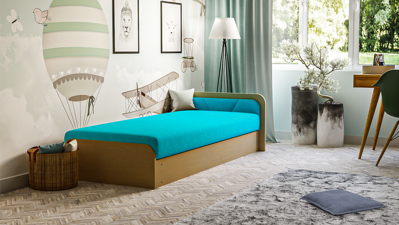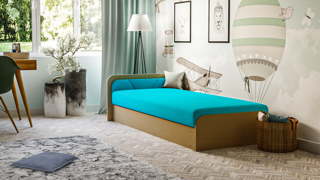 Pat pentru camera copilului, deschidere dreapta, 80x190 cm, ELTAP, PS-01, Parys, lemn/poliester, natur/albastru deschis