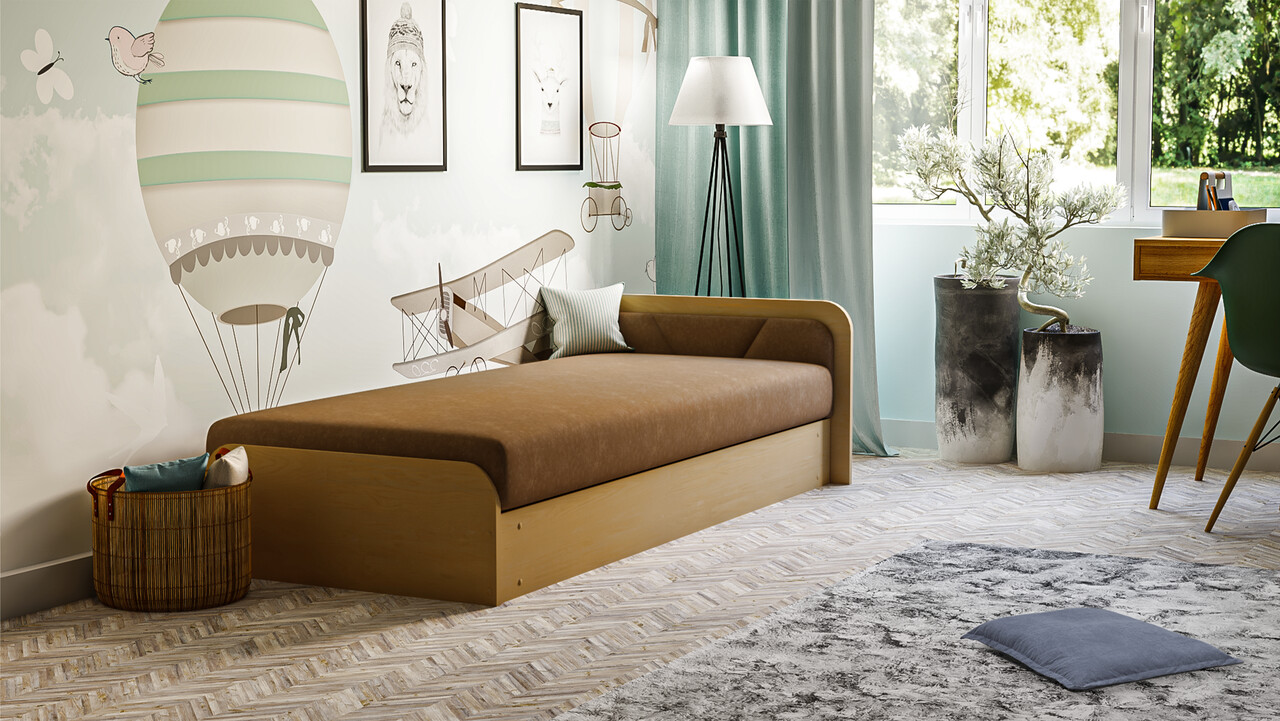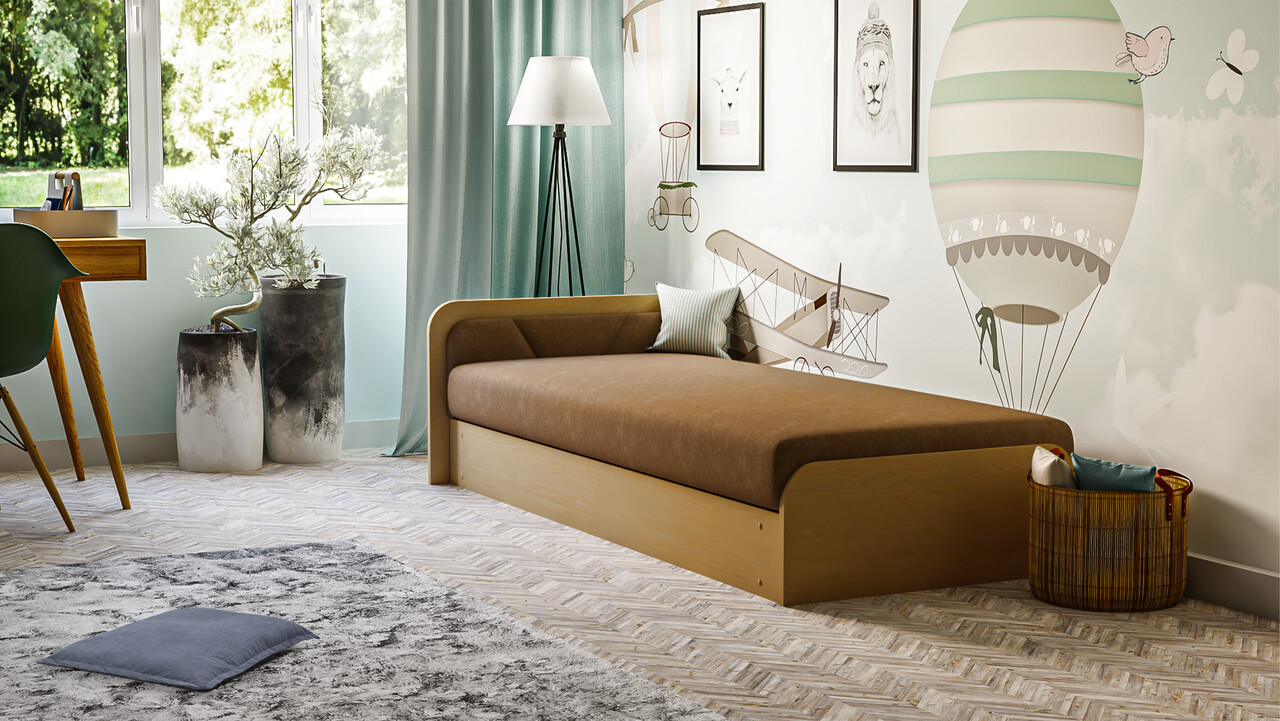 Pat pentru camera copilului, deschidere dreapta, 80x190 cm, ELTAP, PS-03, Parys, lemn/poliester, natur/maro