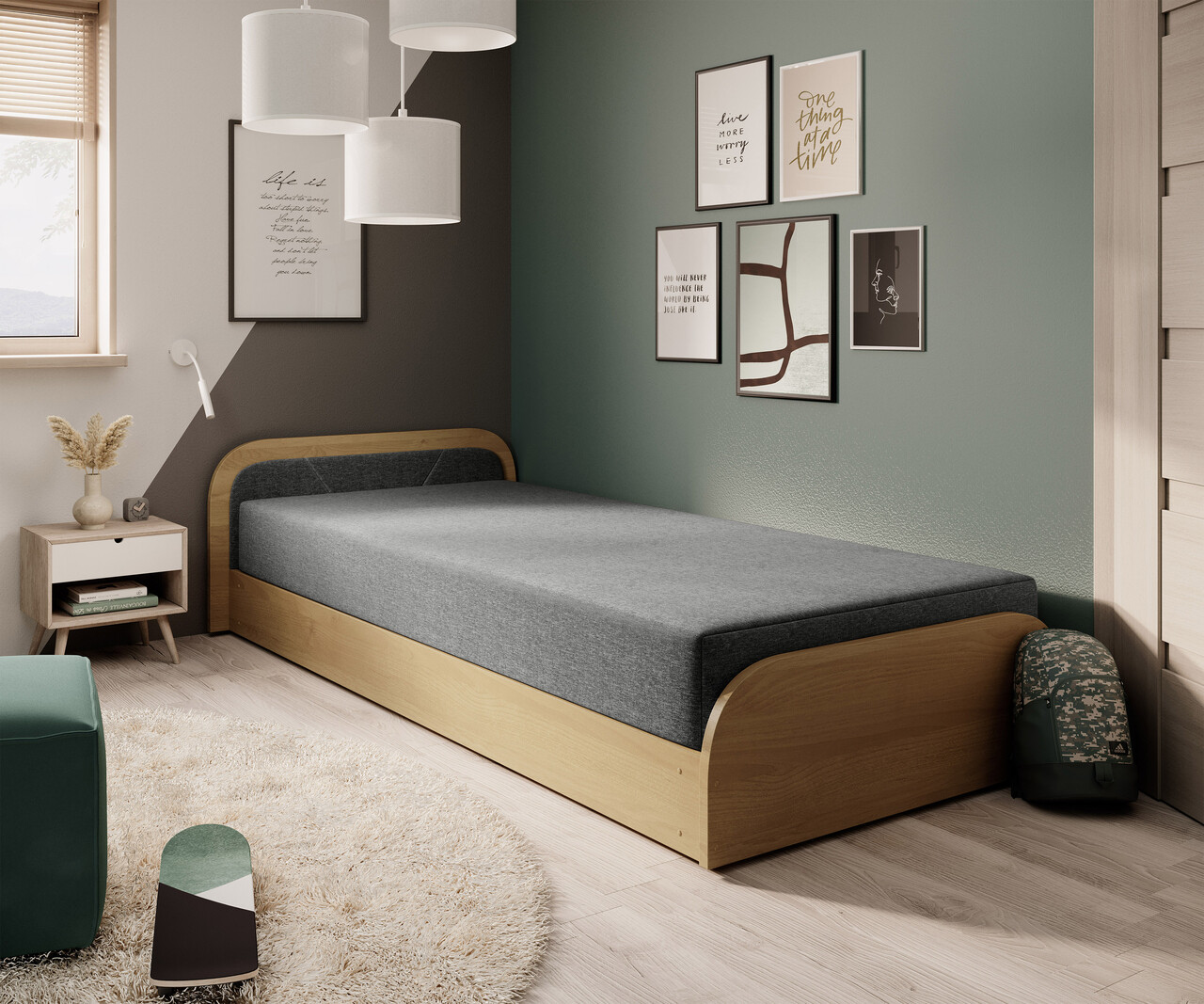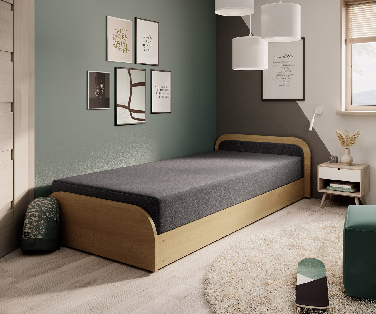 Pat pentru camera copilului, deschidere dreapta, 80x190 cm, ELTAP, PS-04, Parys, lemn/poliester, natur/gri inchis