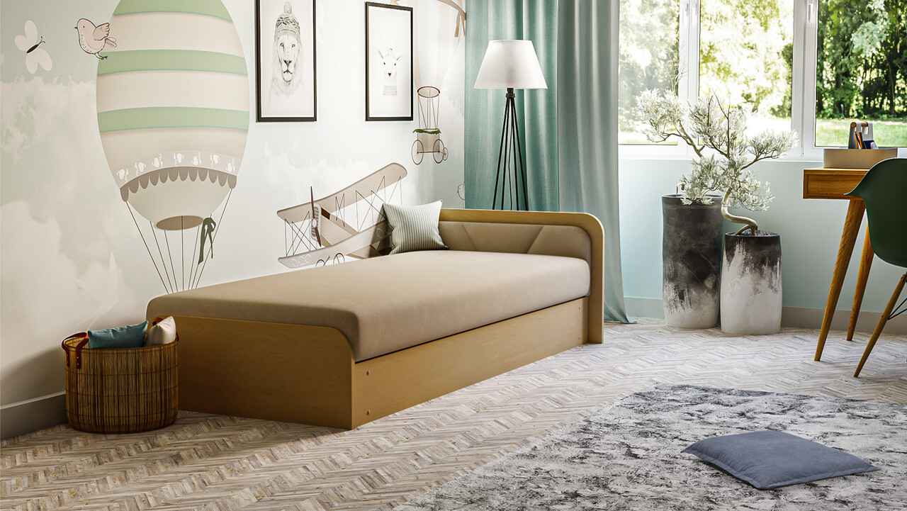 Pat pentru camera copilului, deschidere dreapta, 80x190 cm, ELTAP, PS-02, Parys, lemn/poliester, natur/bej deschis