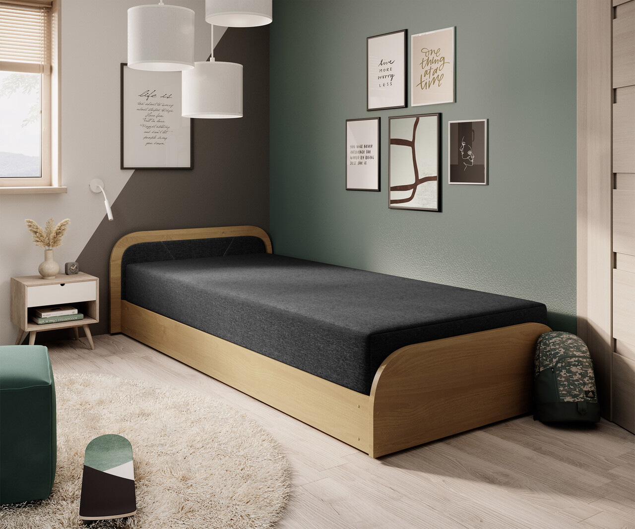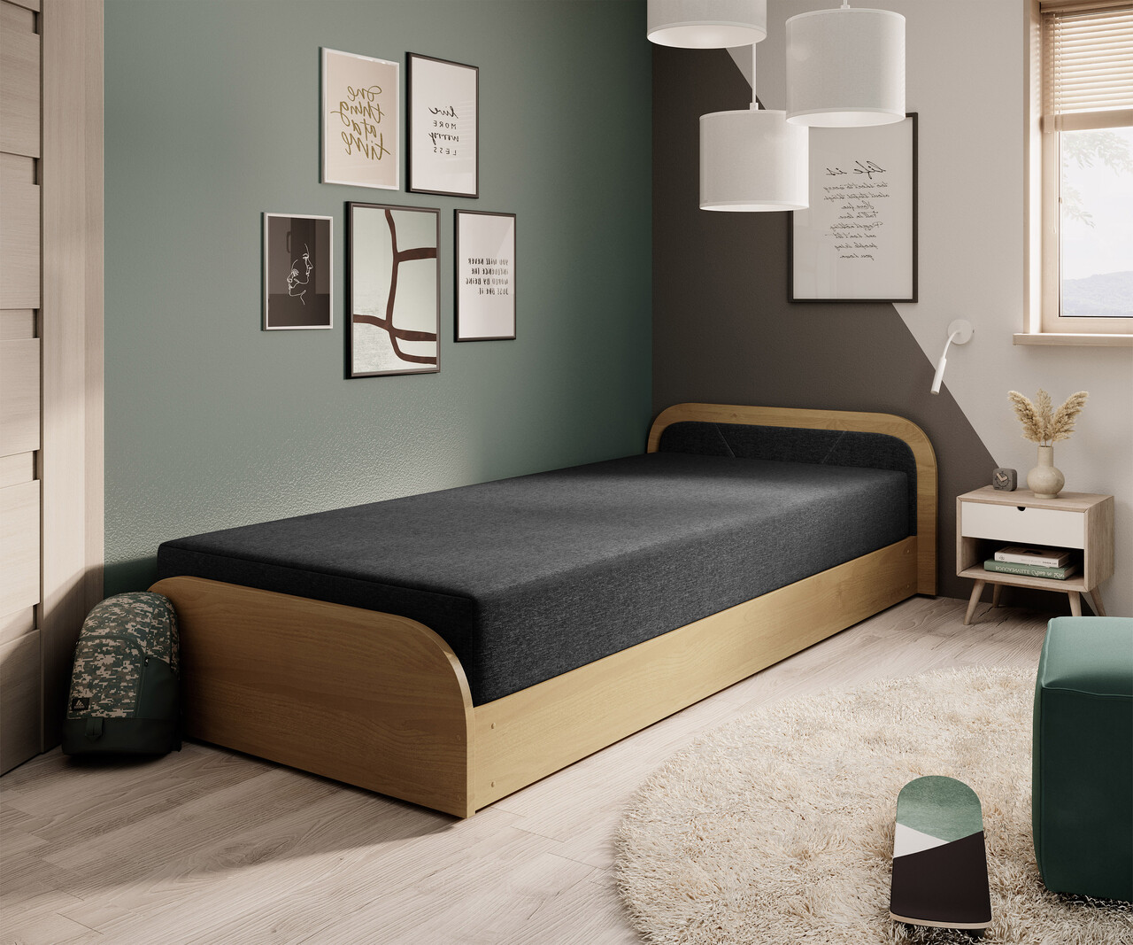 Pat pentru camera copilului, deschidere dreapta, 80x190 cm, ELTAP, PS-05, Parys, lemn/poliester, natur/negru