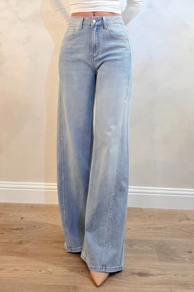 Blugi evazati Veyra, croi wide leg cu cristale, Albastru deschis