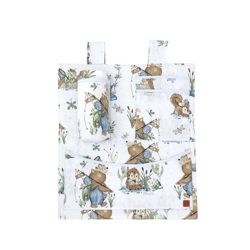 Organizator pentru patut si leagan, MimiNu, Din bumbac certificat Oeko Tex Standard 100, 3 compartimente, 53x46 cm, Design, Lets Go Blue