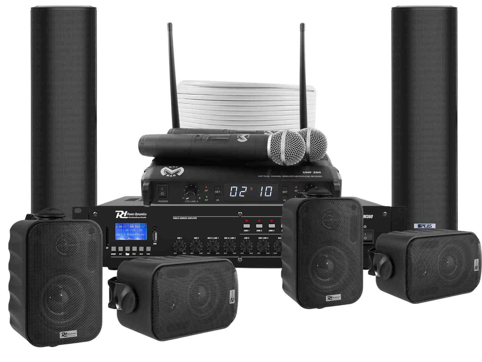 Sonorizare biserica pentru interior-exterior, statie cu 2 microfoane wireless, amplificator, 4 boxe perete, 2 difuzoare PA, KITBIS6040B
