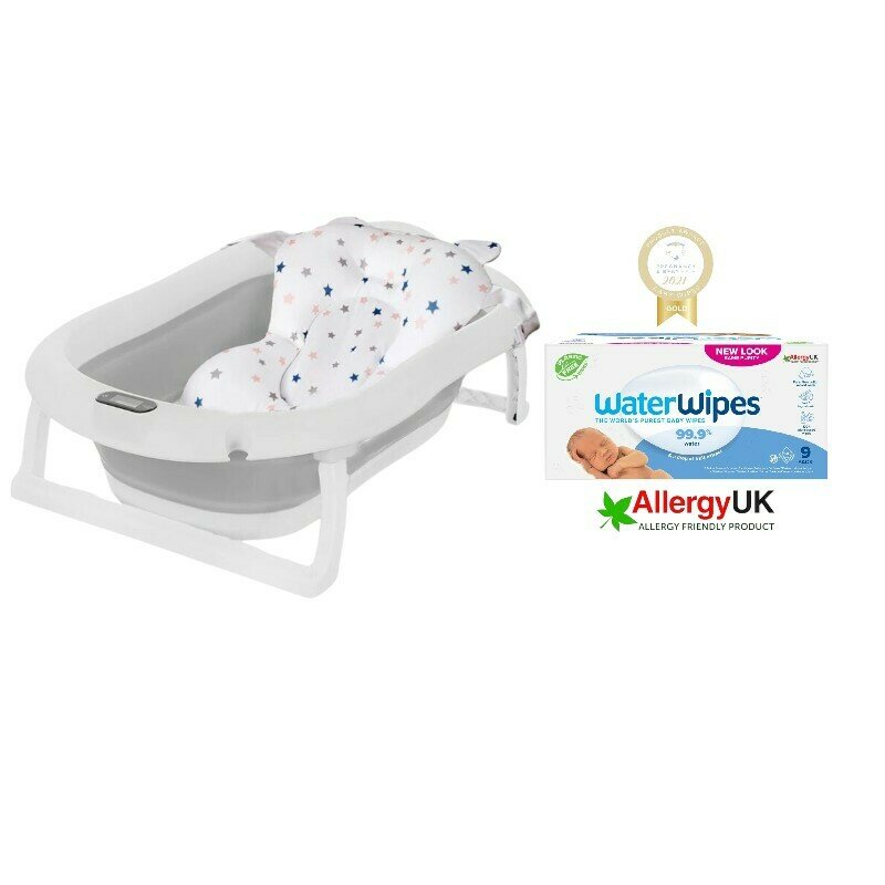 Set cadita bebe, Primabobo, Genua Premium, cu termometru, dop si suport anatomic, Gri + servetele umede Water Wipes, biodegradabile, fara alcool, plastic si parfum, 540 bucati, pe baza de apa
