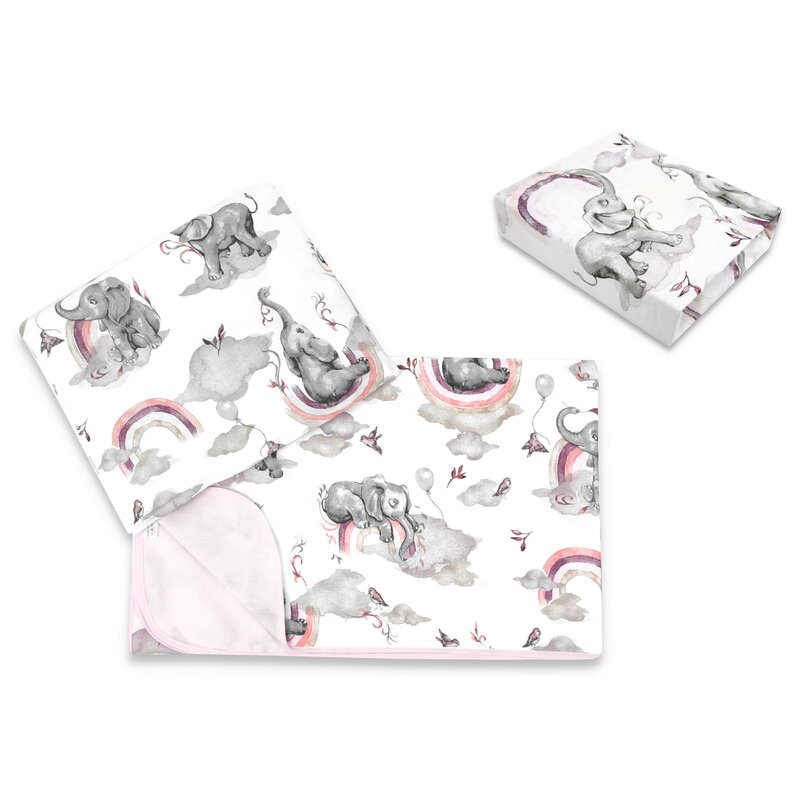 Paturica de infasat, Qmini, Cu doua fete, Cu multiple utilizari, Cu inchidere arici velcro, Dimensiune 75x75 cm, Din bumbac certificat Oeko Tex Standard 100, Elephants on Rainbow Pink