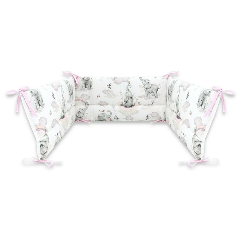Lenjerie patut 3 piese Qmini cu protectie laterala din bumbac 140x70 cm Elephants on Rainbow Pink