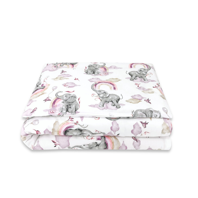 Lenjerie patut junior cu 2 piese, Qmini, Din bumbac certificat Oeko Tex Standard 100, 140 x 200 cm, Elephants on Rainbow Pink