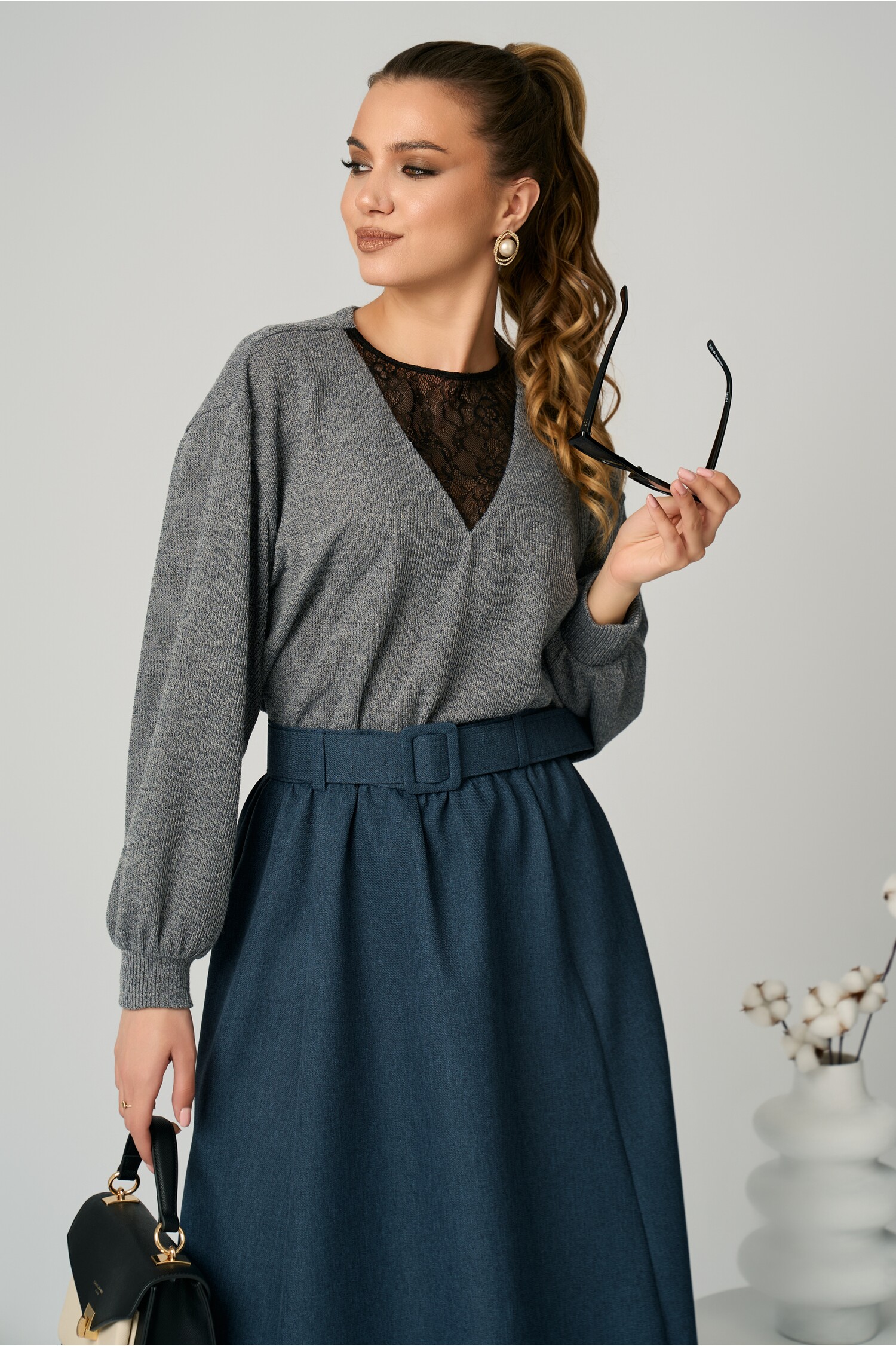 Bluza DY Fashion smart-casual din jerse gri cu insertie din dantela