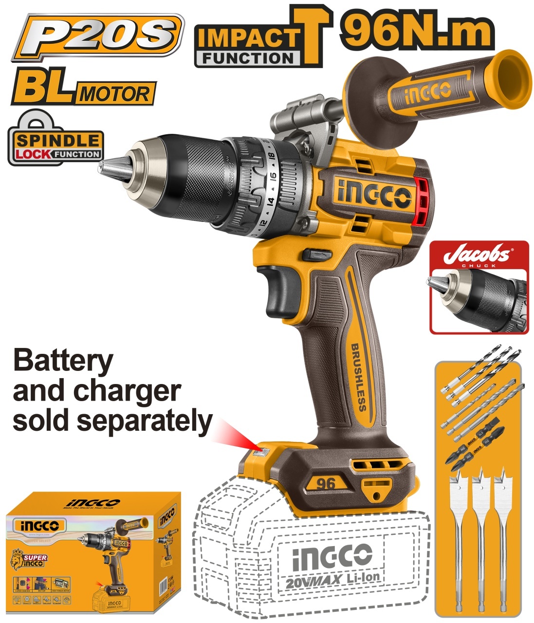 Masina de Gaurit si Insurubat cu Impact 20V INGCO CIDLI209685, 96Nm, brushless, 2 viteze 0-550/2100 rpm, 31500 bpm, mandrina metalica 13 mm, fara acumulator si incarcator