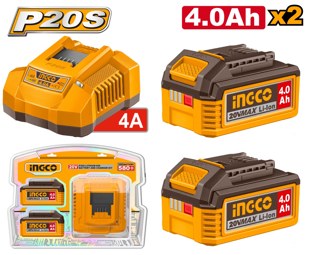 Set 2 Baterii 20V 4Ah + Incarcator Rapid INGCO – FBCPK2013E, Li-Ion, 4A, compatibil platforma P20S, cu LED indicator, autonomie extinsa Acumulator Ingco FBCPK2013E