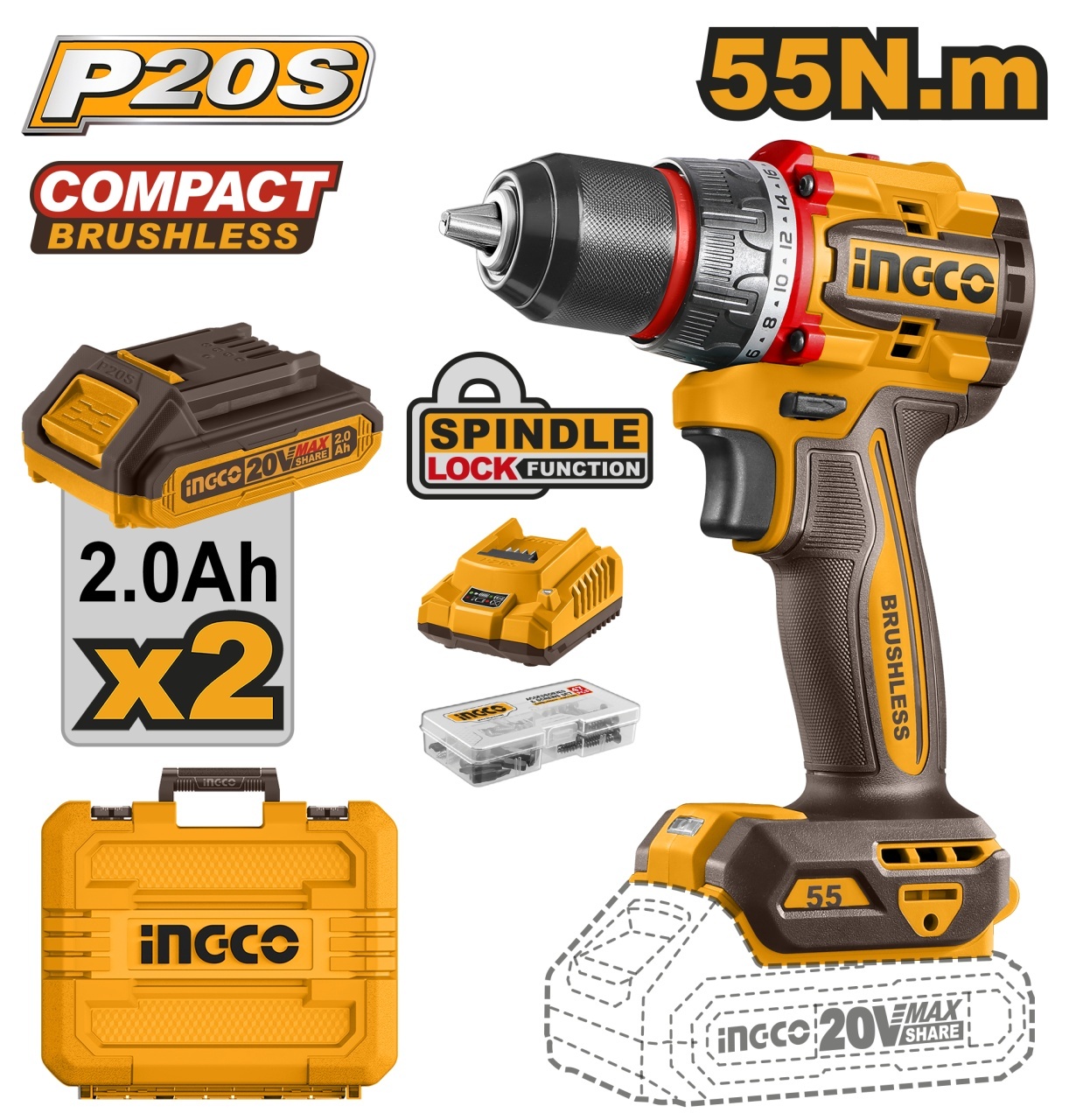 Masina de Gaurit si Insurubat 20V INGCO CDLI20558E, 55Nm, brushless, 2 viteze 0-500/2000 rpm, mandrina metalica 13 mm, 2 acumulatori 2.0Ah, incarcator, 47 accesorii