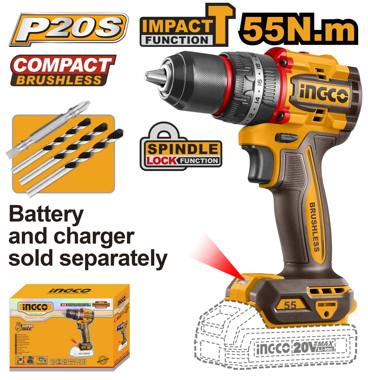 Masina de Gaurit si Insurubat cu Impact 20V INGCO CIDLI205581, 55Nm, brushless, 2 viteze 0-500/2000 rpm, 30000 bpm, mandrina metalica 13 mm, fara acumulator si incarcator