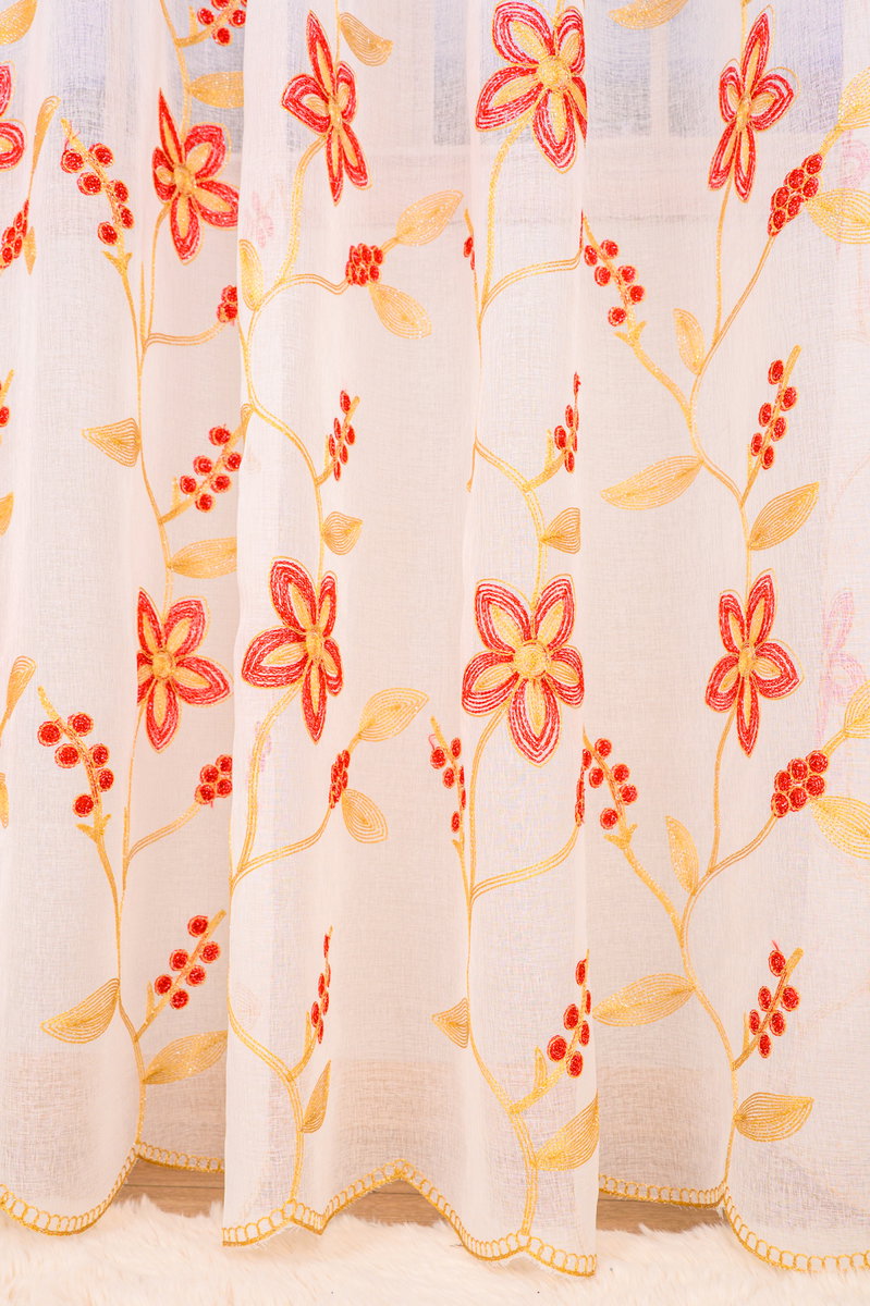 Set Mirimah - Perdea din Matase Alba si Draperie Brodata Flori pe Panza Crem