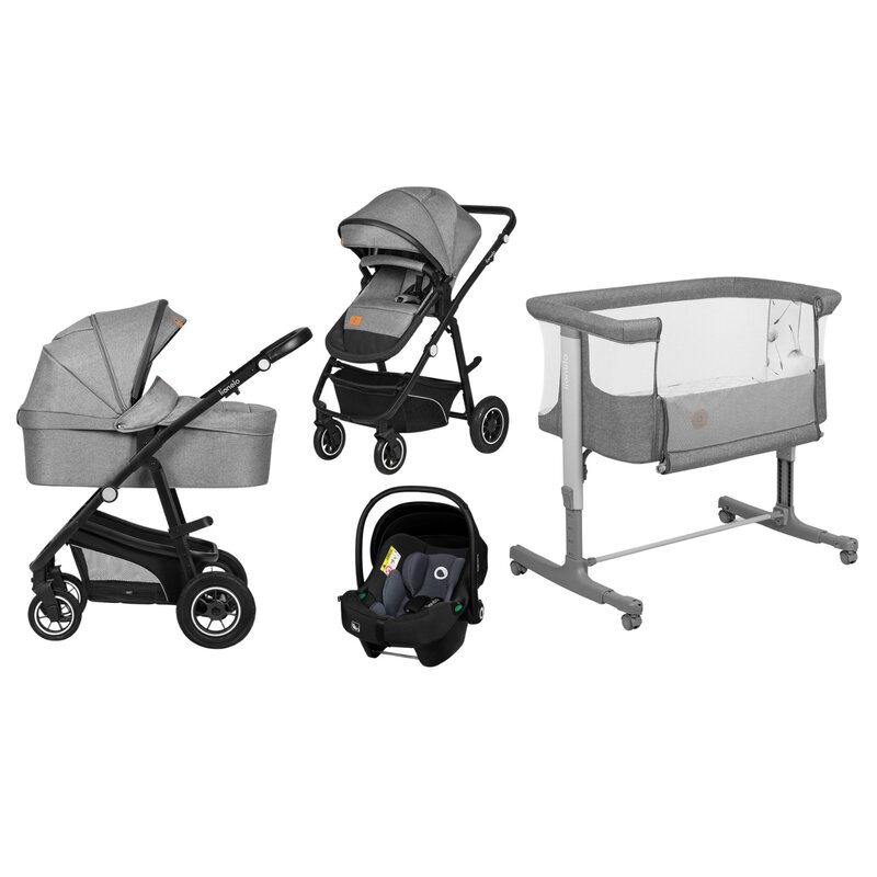 Pachet complet pentru primele zile, Carucior 3 in 1, Lionelo, Bianka, Transformabil, Cu landou, salteluta moale, geanta pentru parinti + Patut co-sleeper, Lionelo, Aurora, 3 in 1, Cu saltea si geanta transport, Gri