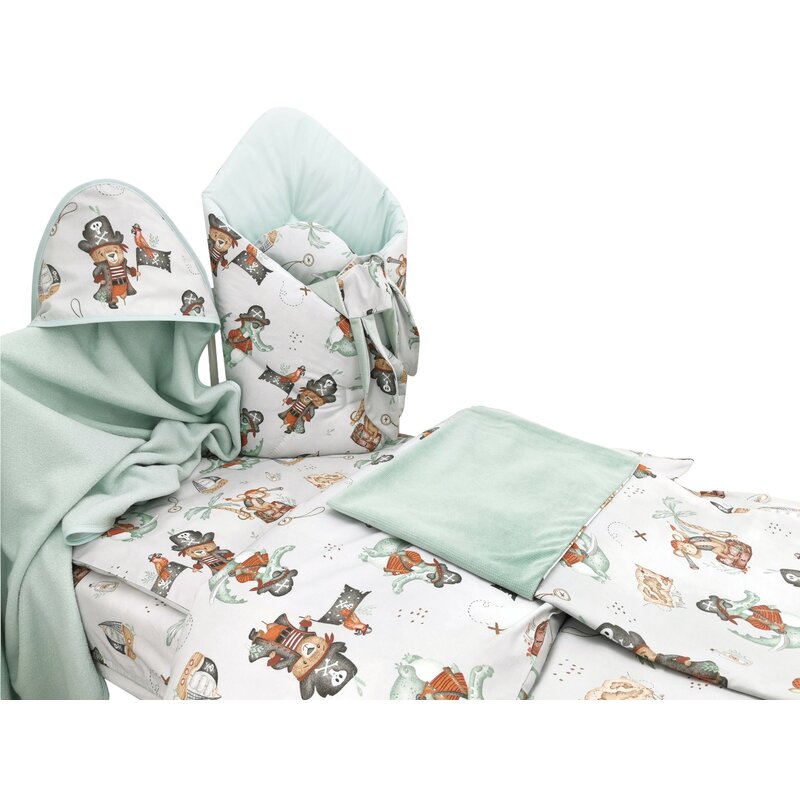 Set pentru bebelusi cu 6+1 piese, MimiNu, Cu paturica de infasat, Prosop, Paturica, Cearceaf 120x60 cm, Fata de perna, Husa pilota, Jucarie textila senzoriala, Din bumbac certificat Oeko Tex Standard 100, 135x100 cm, Design, Pirates Natural